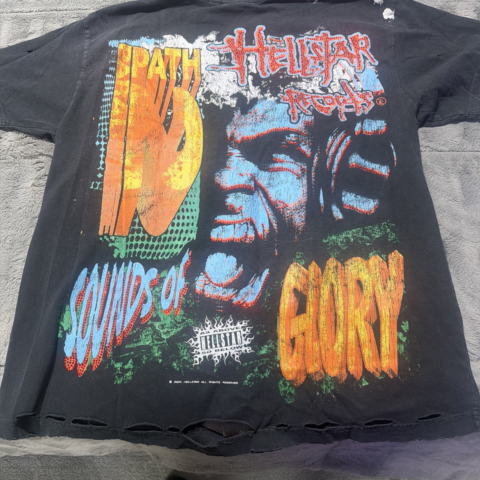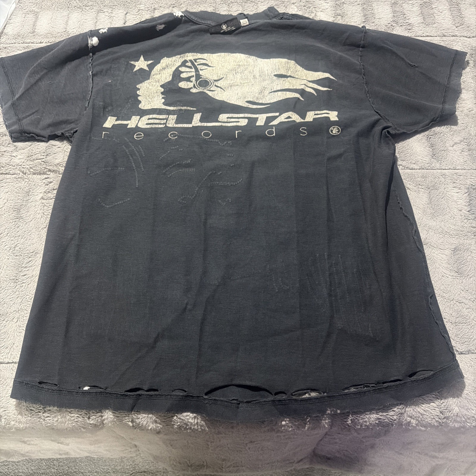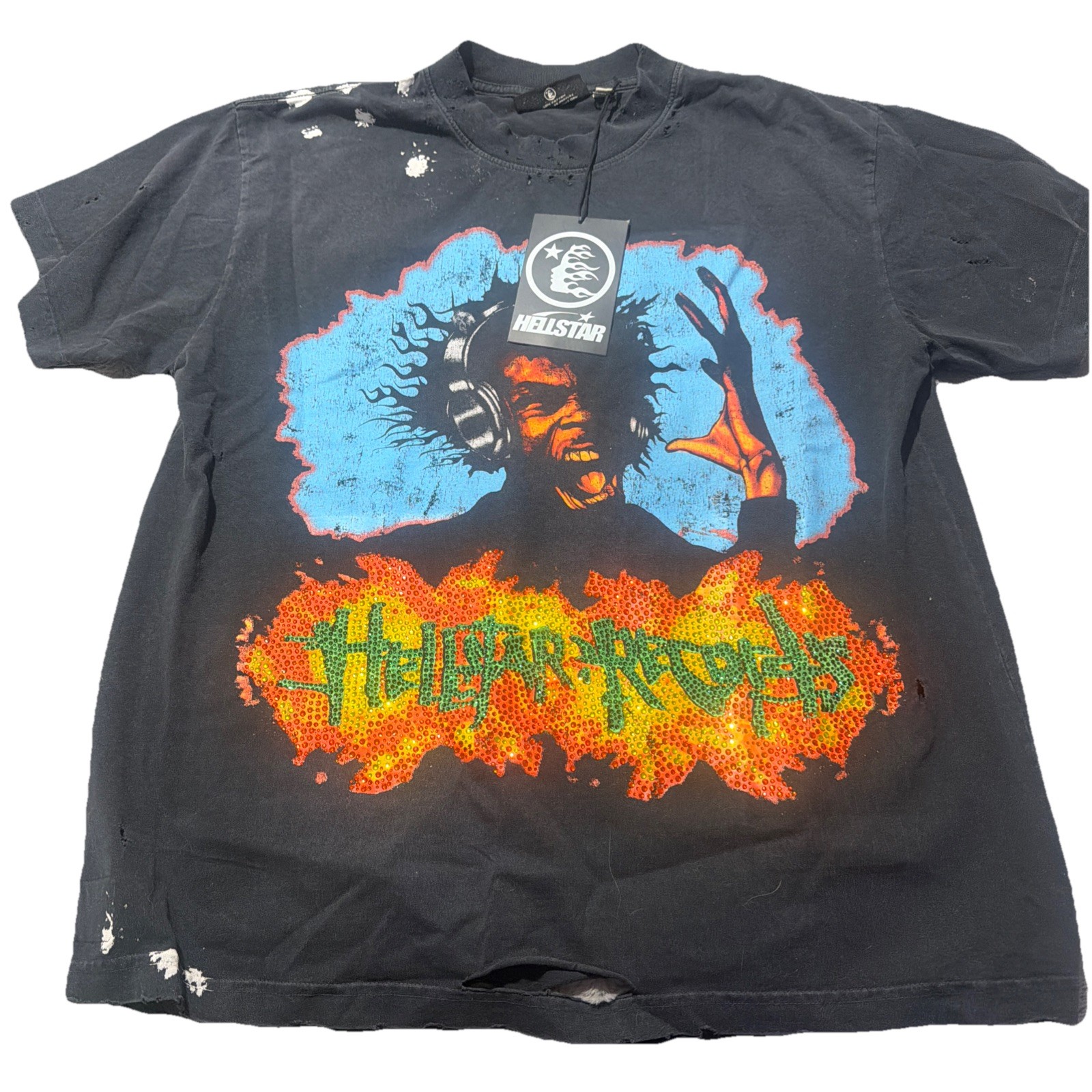 This product is a 100% authentic Hellstar brand t-shirt in black, size medium. It features a graphic print with colored studded gems, a round neck, short sleeves, and is made of cotton material. The regular fit makes it suitable for men who wear a size medium t-shirt. Perfect for those looking for a stylish and comfortable addition to their wardrobe. this is a reversible shirt.