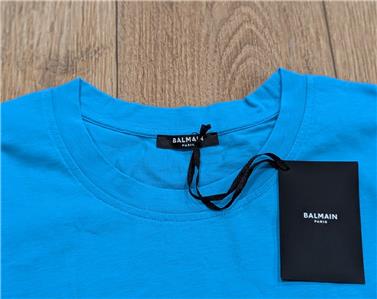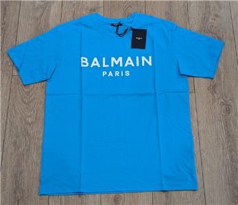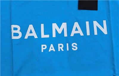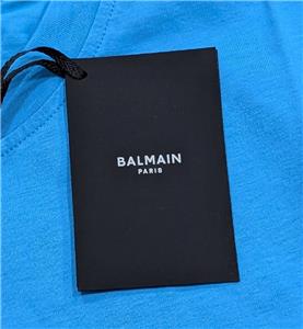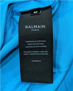 $650 Mens BALMAIN Printed Logo Cotton Graphic Crewneck T-Shirt Light Blue Medium