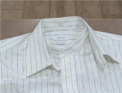 Flaunting a striped motif, this McQueen shirt is crafted of cotton. The long-sleeve garment boasts a detachable point collar and a short stand collar. A button-front placket fastens this piece.