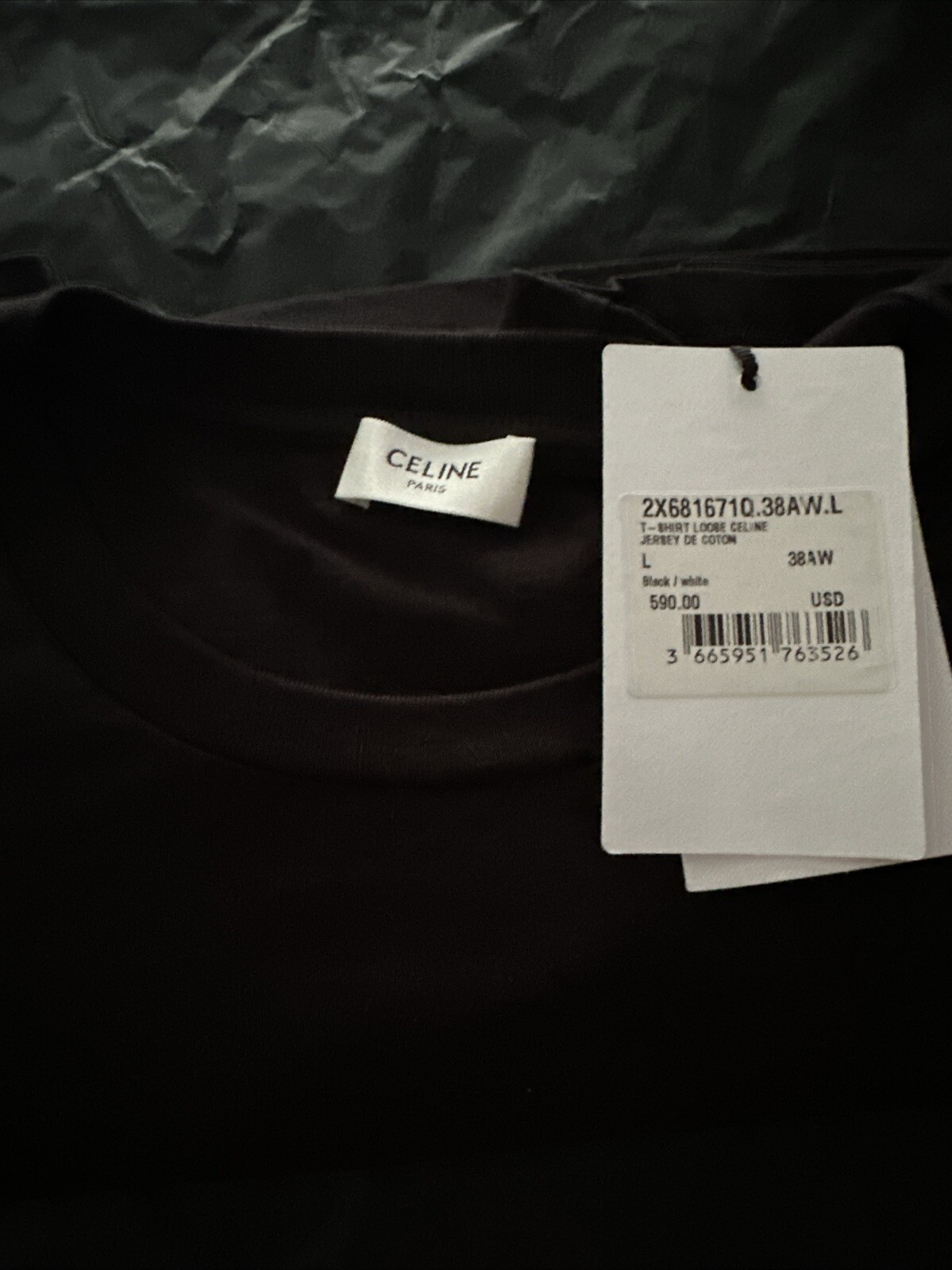 Never worn Celine black t shirt size large . Hard to find . Comes with original bag , tags still attached wrapped in original tissue from store . Serious inquiries only .
