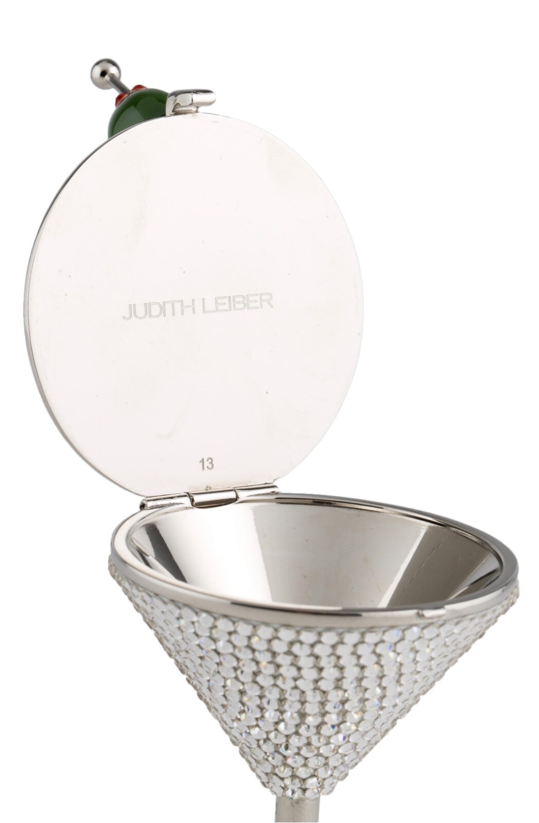 This signature city-girl pillbox is rendered in shimmering rhine crystals and is garnished with a juicy olive.