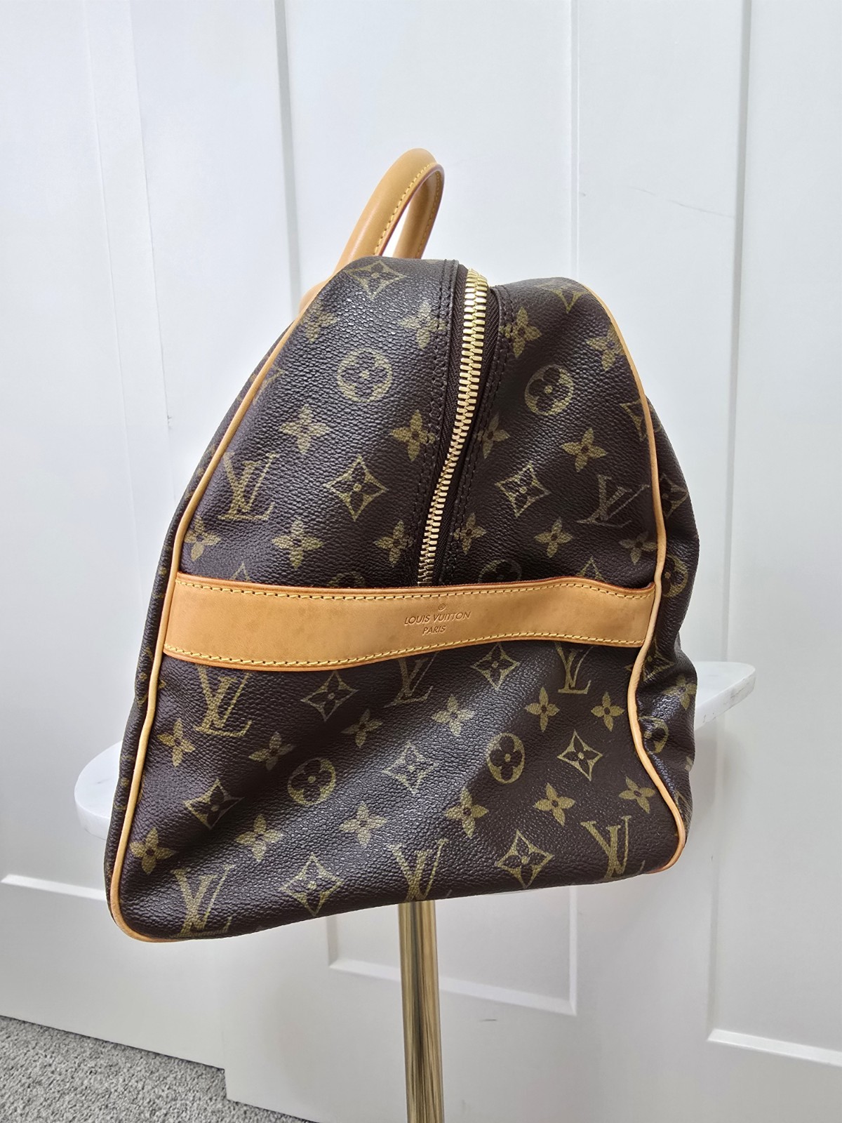 The Louis Vuitton Monogram Carryall Boston Bag is a stylish and spacious travel handbag designed for women and men. With a rectangular shape and a large size, this satchel/top handle bag features a classic brown monogram exterior made of coated canvas, complemented by gold hardware accents. The bag includes a zip closure, a fabric lining in brown, and leather handles with a 5.5-inch drop for easy carrying. Perfect for travel occasions, this Louis Vuitton handbag exudes luxury and timeless elegance with its iconic monogram pattern. LOUIS VUITTON Monogram Carryall Boston Bag Travel Handbag M40074 - 27cm x 40.5cm x 22.5cm / 10.62'' x 15.94'' x 8.85''