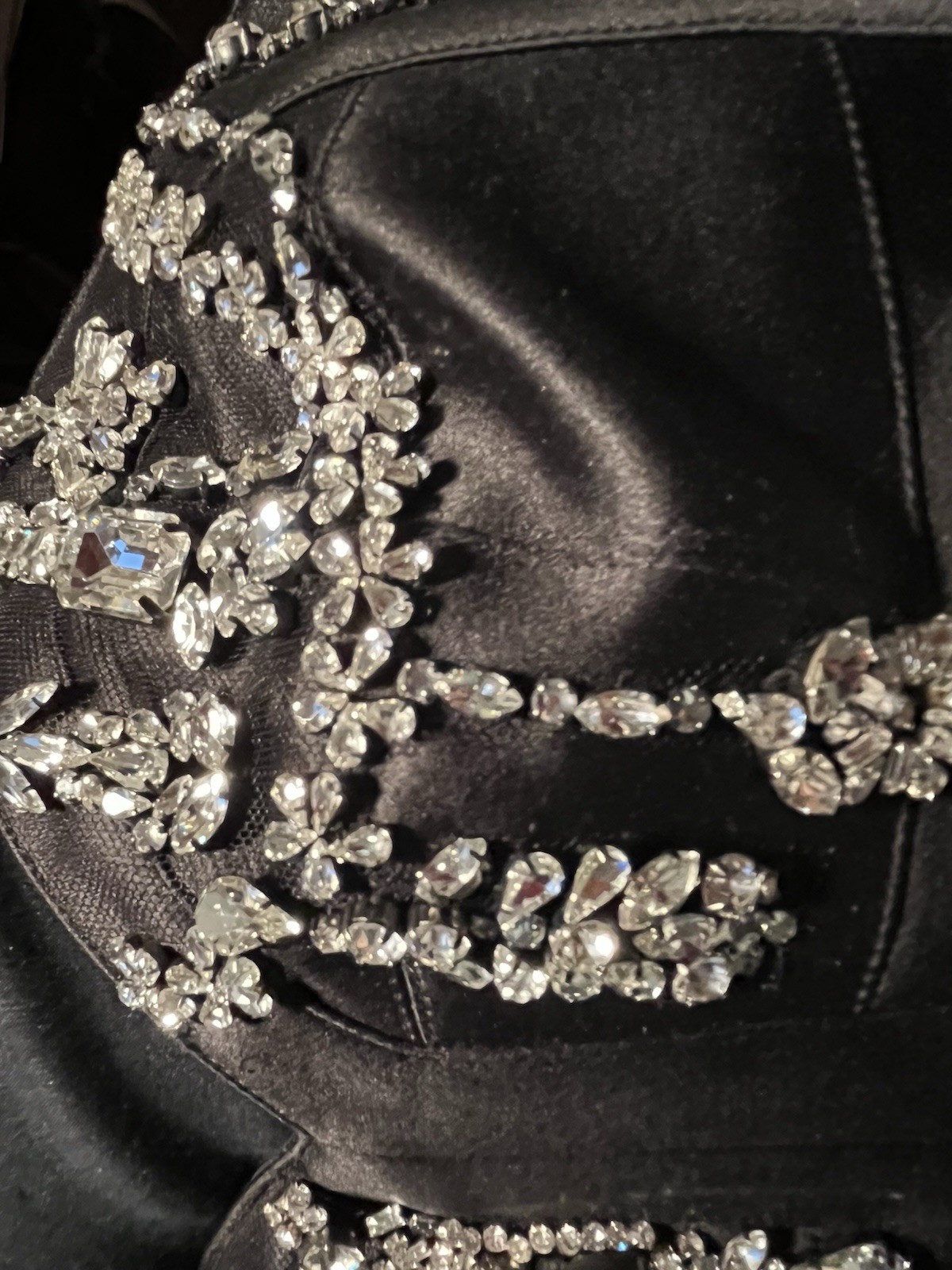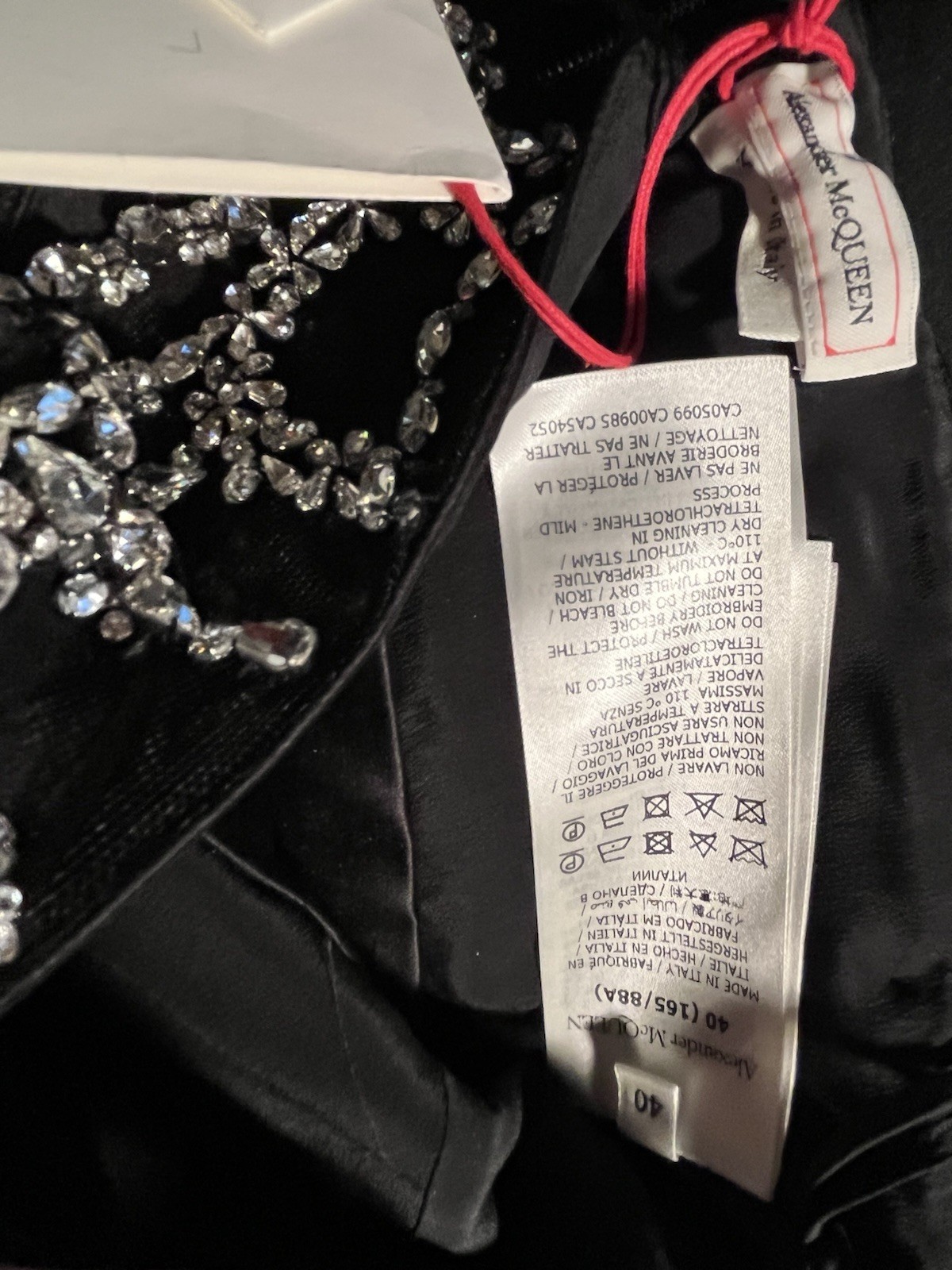 For your consideration is a breathtaking Alexander McQueen couture quality jeweled crystal raindrop embroidered black satin and tulle bra top from the Spring Summer 2022 collection. This striking piece features intricate sparkling crystal in a chandelier inspired design using the famous crystal raindrop embroidery technique, making it a stylish and glamorous choice for red carpet or intimate soirée. The elegant black satin material adds a touch of luxury, making it a high-end wardrobe essential. Zip closure in back. Material is a blend of cotton and silk. Made in Italy. Sized Italian 40 or small. Original tags attached - including extra crystals.