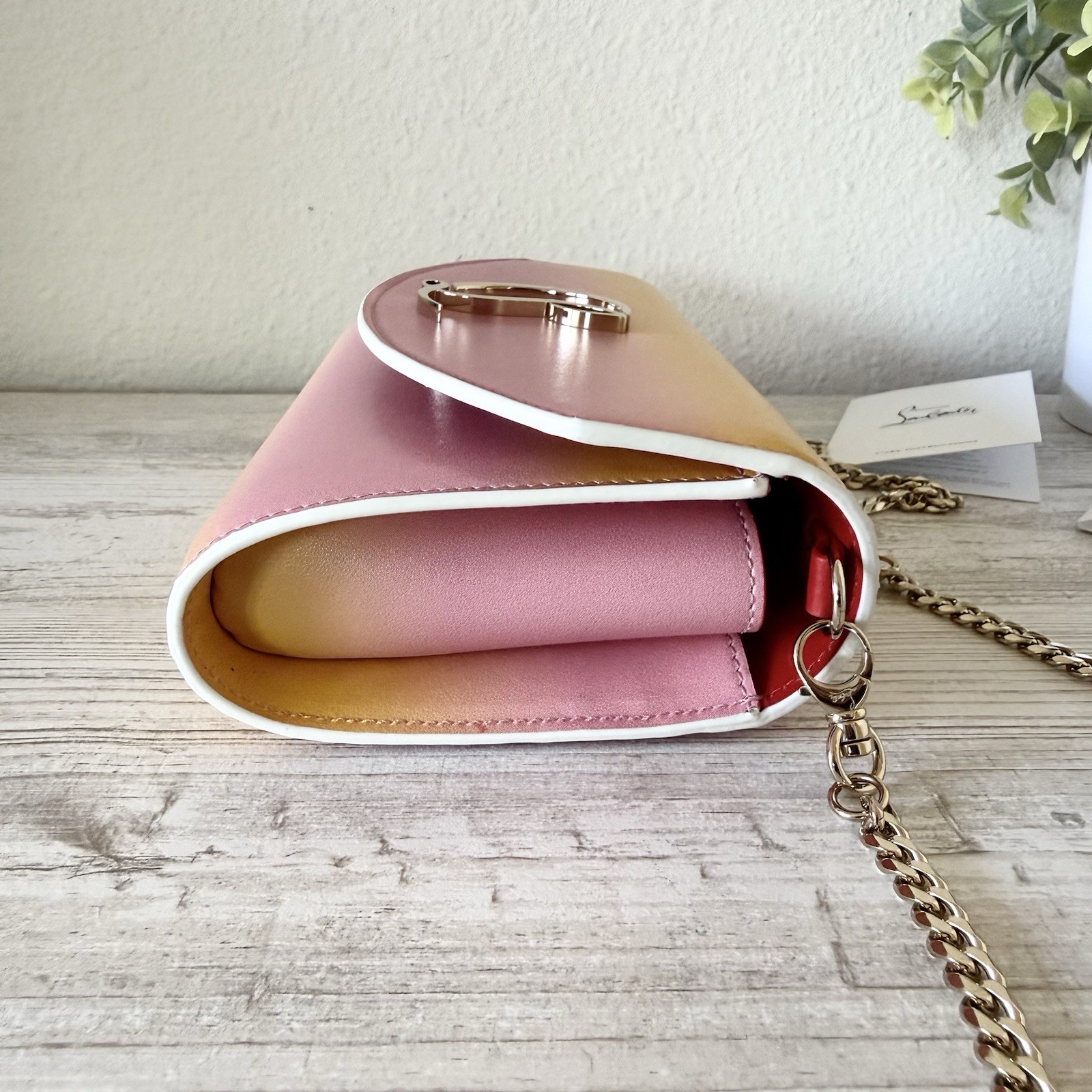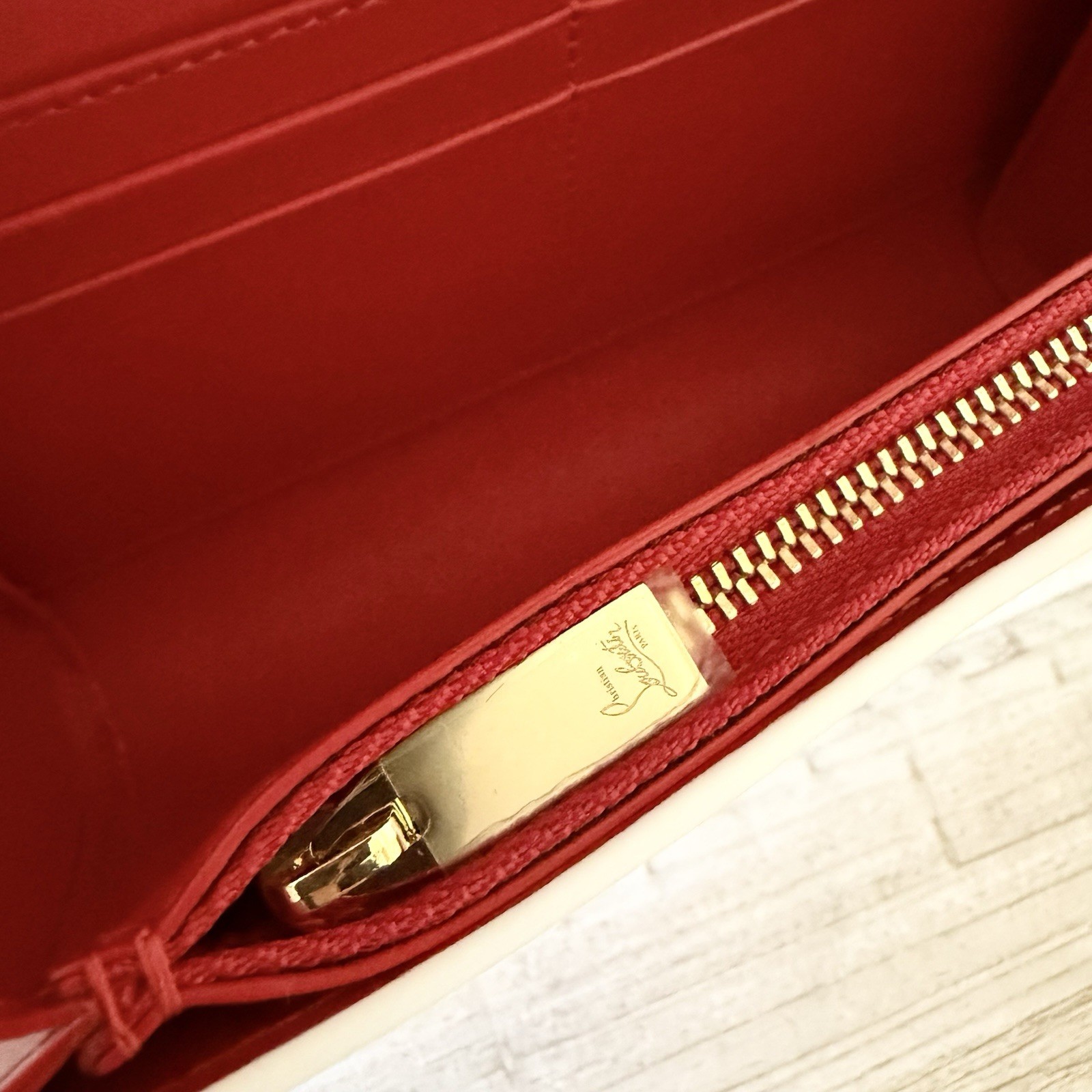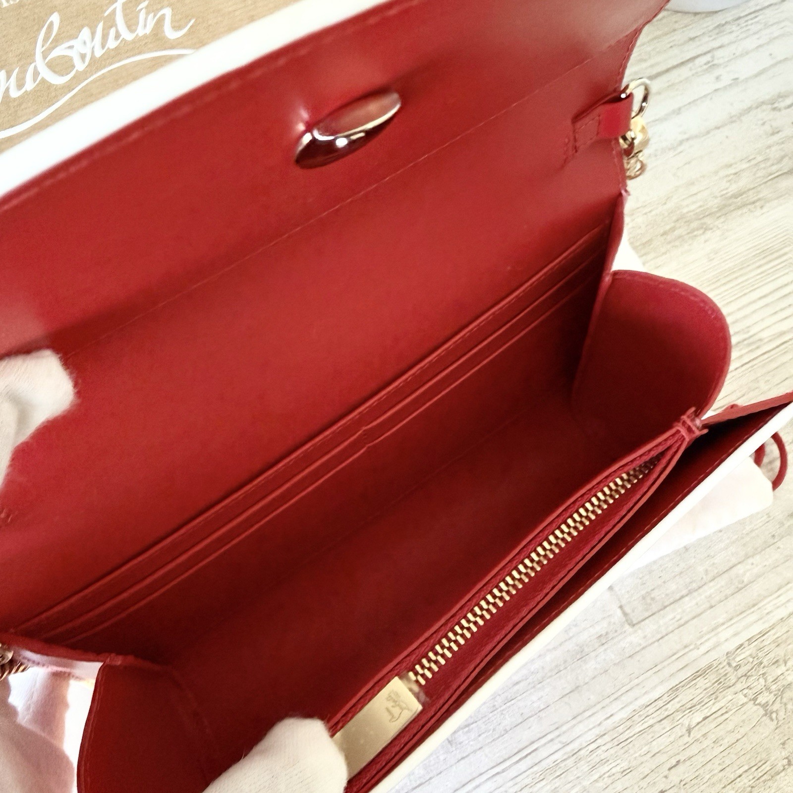 New with CL box, dust bag, cards. • Christian Louboutin "Loubi54" wallet/clutch in leather • Features tonal signature CL logo accent • Detachable chain shoulder strap • Can be worn as a wallet or shoulder bag • Envelope flap top with magnetic closure • Center zip compartment divides interior; card slots • Signature red lining • Approx. 4"H × 7.5 W × 2"D • Made in Italy The last photo shows the same style and size bag but in different color. Fits with up to iphone max, lipstick, cards.