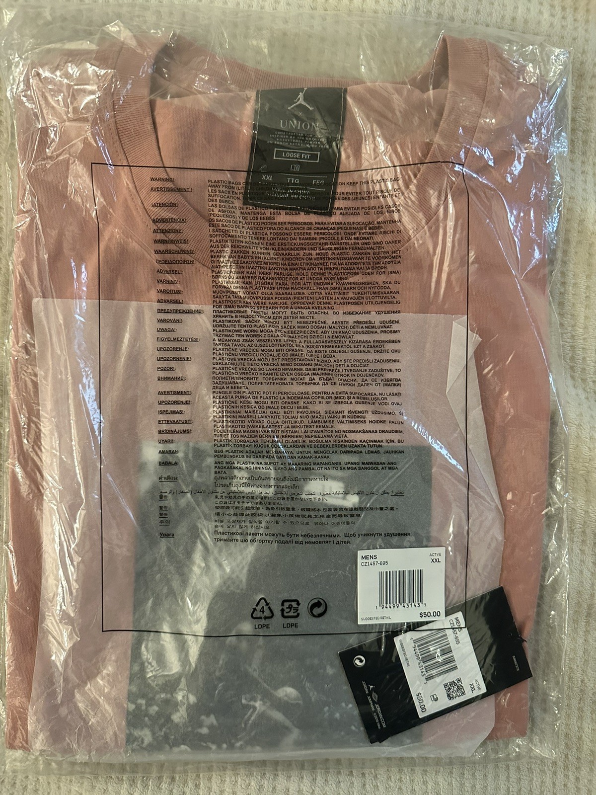 The Nike Air Jordan X Union Reverse Dunk T-shirt in Rust Pink, size XXL, is a stylish and comfortable option for men's clothing. This short sleeve shirt features a solid pattern with the iconic Air Jordan character, making it a must-have for any fan of the brand. Made from cotton, this t-shirt is perfect for the summer, fall, and spring seasons, and showcases the Nike Air product line. The crew neck design adds a classic touch to this trendy and fashionable piece.