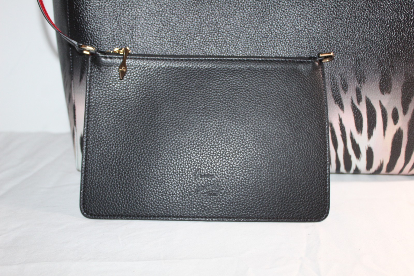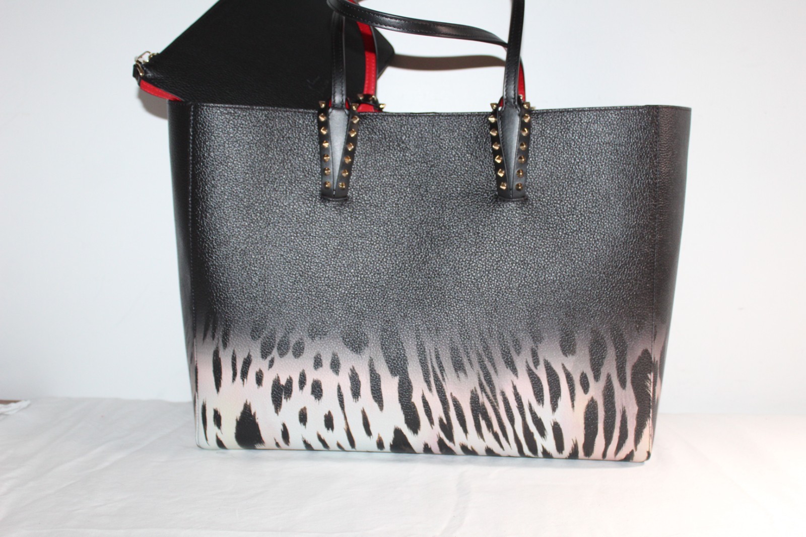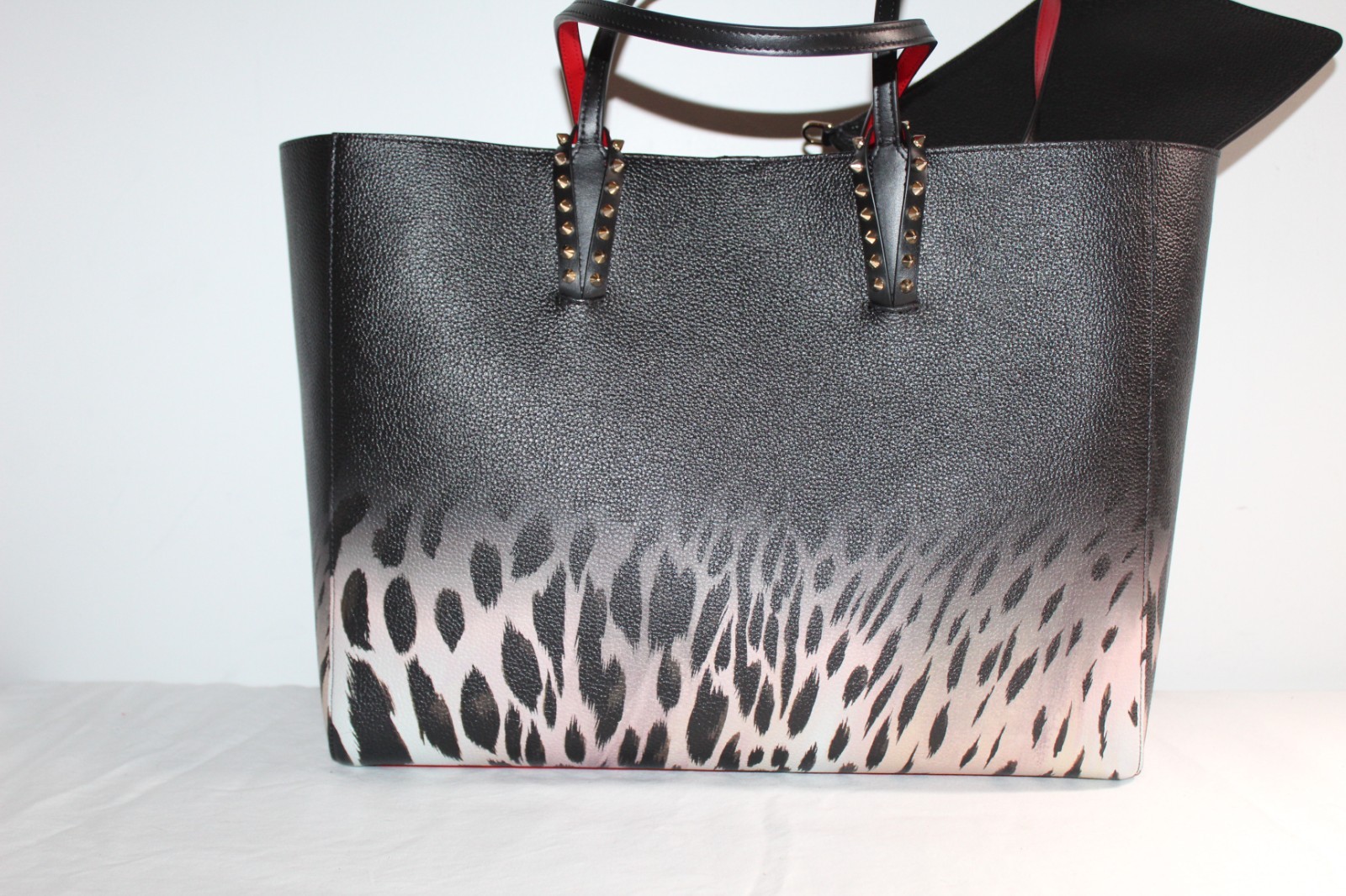 This is an authentic CHRISTIAN LOUBOUTIN Calfskin Leo Soft Tote Bag Ombre Spikes Cabata Tote. This chic tote is crafted of calfskin leather with a leopard ombre print. This shoulder bag features back and red leather strap handles with studded anchors. The top is open to a red leather interior with a removable pouch.