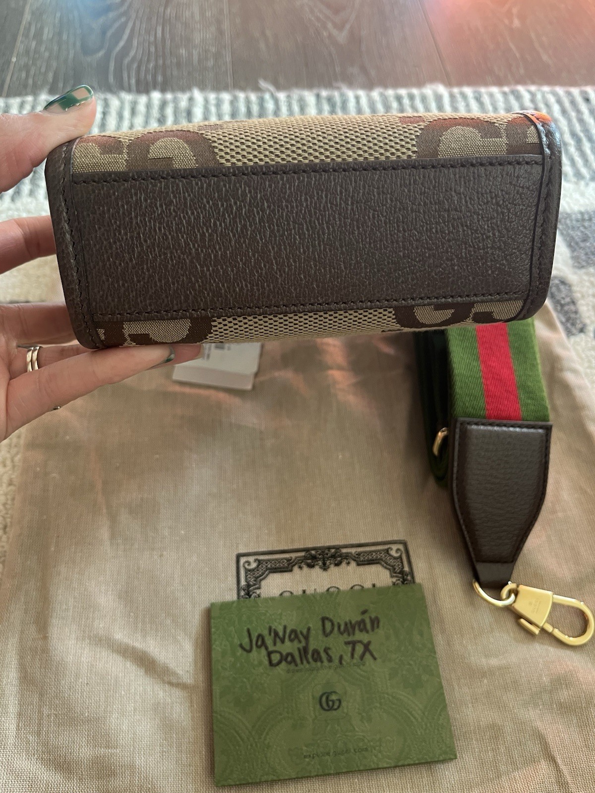 - NEW with tag attached - No damage/flaws - Includes original vibrant Gucci strap - Comes with dust bag only - Statement piece that can be a tote, shoulder bag or crossbody. - 3 for 1! - Size: 6.25" (L) x 2.75" (W) x 7.75" (H)