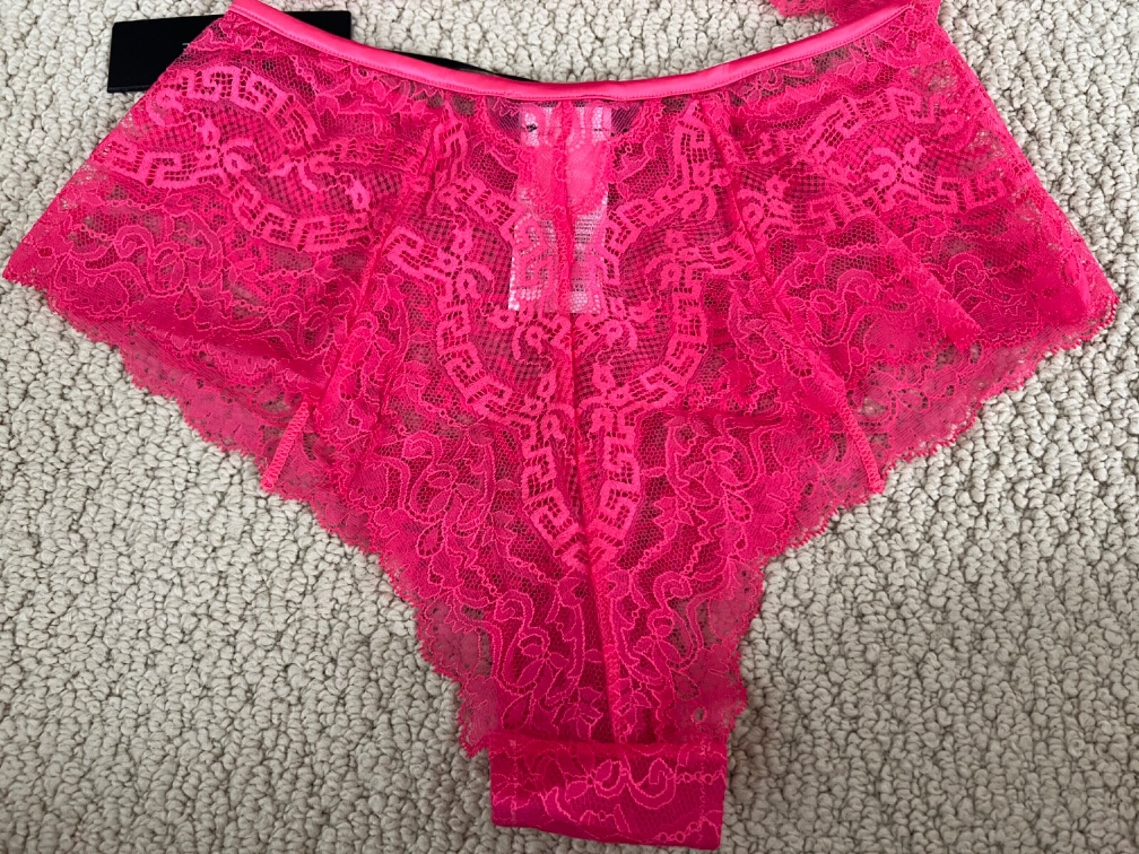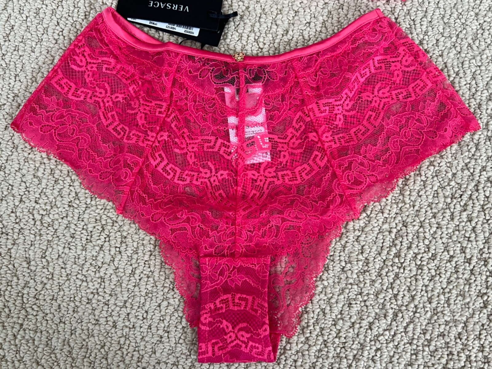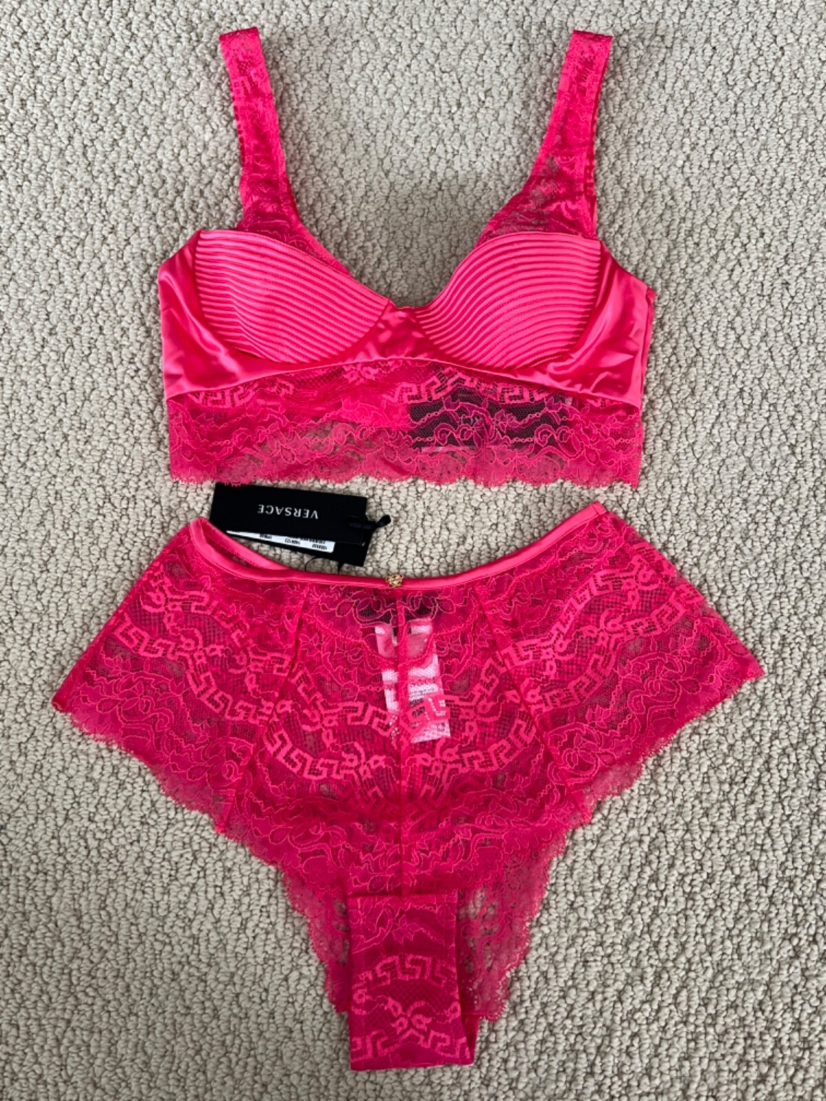 The lingerie set is composed of a bralette bra top and brief panty. The bra top is a sleeveless scoop-neck bralette style in stretch lace and stretch satin. The intricate lace has floral and "Greca" logo Greek Key motifs throughout. It has underwire at the quilted satin cups and has adjustable hook and eye closures at the back. The panty is a high rise brief made of matching floral Greek Key lace and features a gold tone Medusa logo charm at the front. Retail $1295.