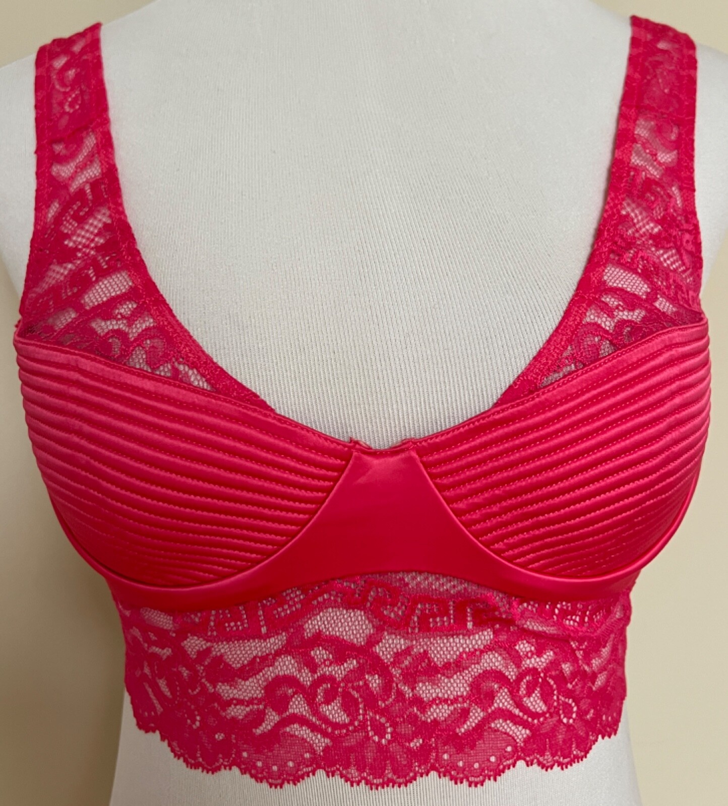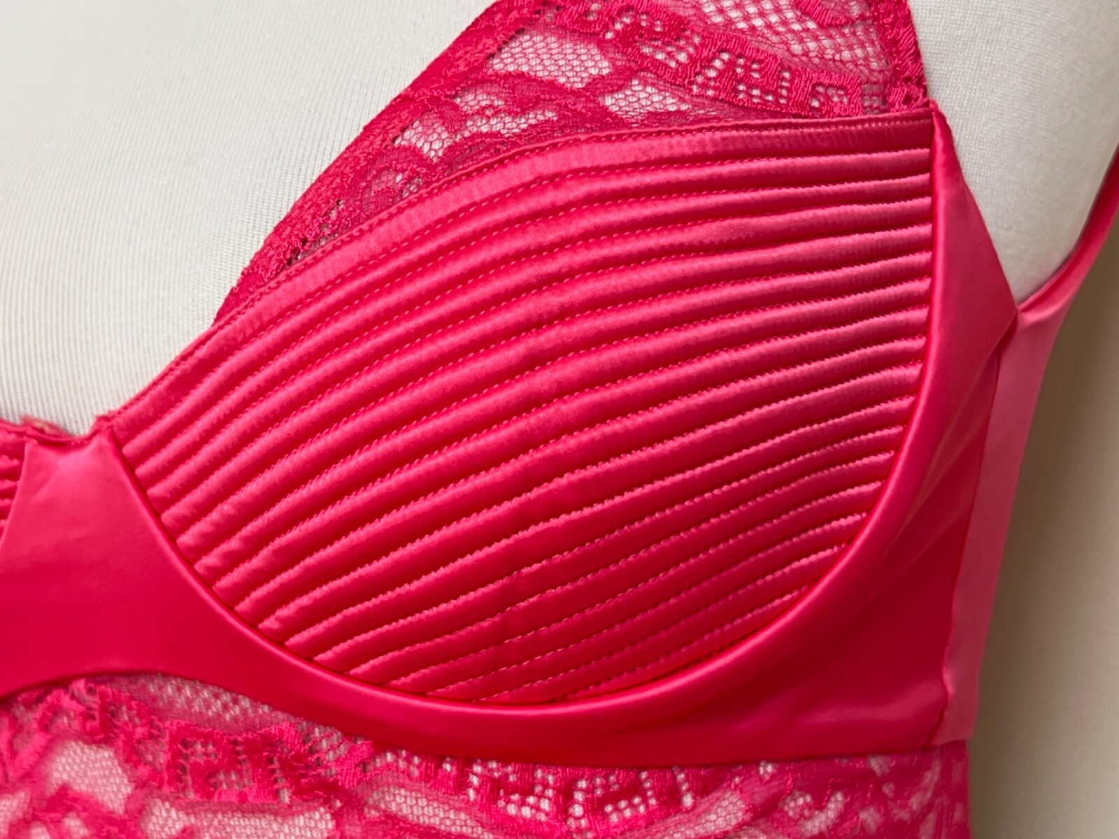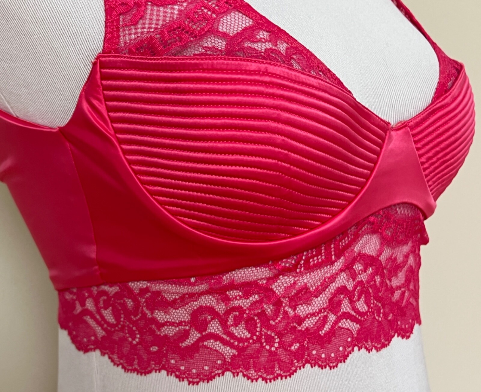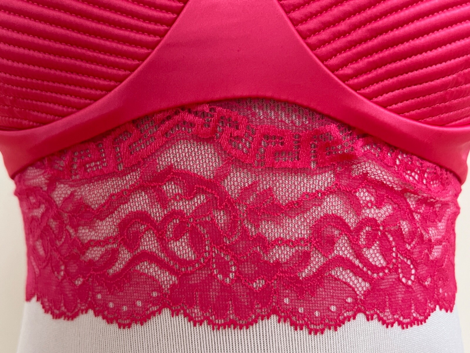 The lingerie set is composed of a bralette bra top and brief panty. The bra top is a sleeveless scoop-neck bralette style in stretch lace and stretch satin. The intricate lace has floral and "Greca" logo Greek Key motifs throughout. It has underwire at the quilted satin cups and has adjustable hook and eye closures at the back. The panty is a high rise brief made of matching floral Greek Key lace and features a gold tone Medusa logo charm at the front. Retail $1295.