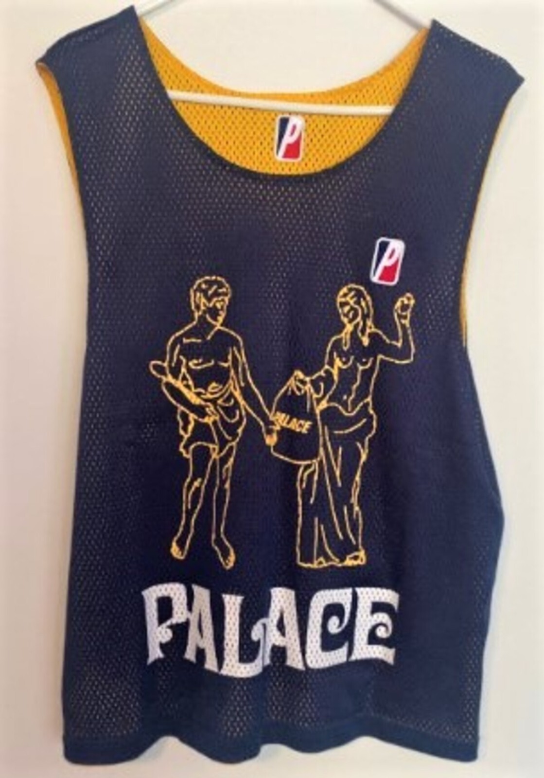 Sporty and colorful reversible sleeveless mesh tank top in navy and yellow. Graphics printed in multicolor throughout. Size: MEDIUM [Men's Relaxed; Chest: 38" - 41" (97 - 104 cm)]. Material: 100% Polyester ). Color: Navy / Yellow. Machine wash. Imported. BRAND NEW with tags.