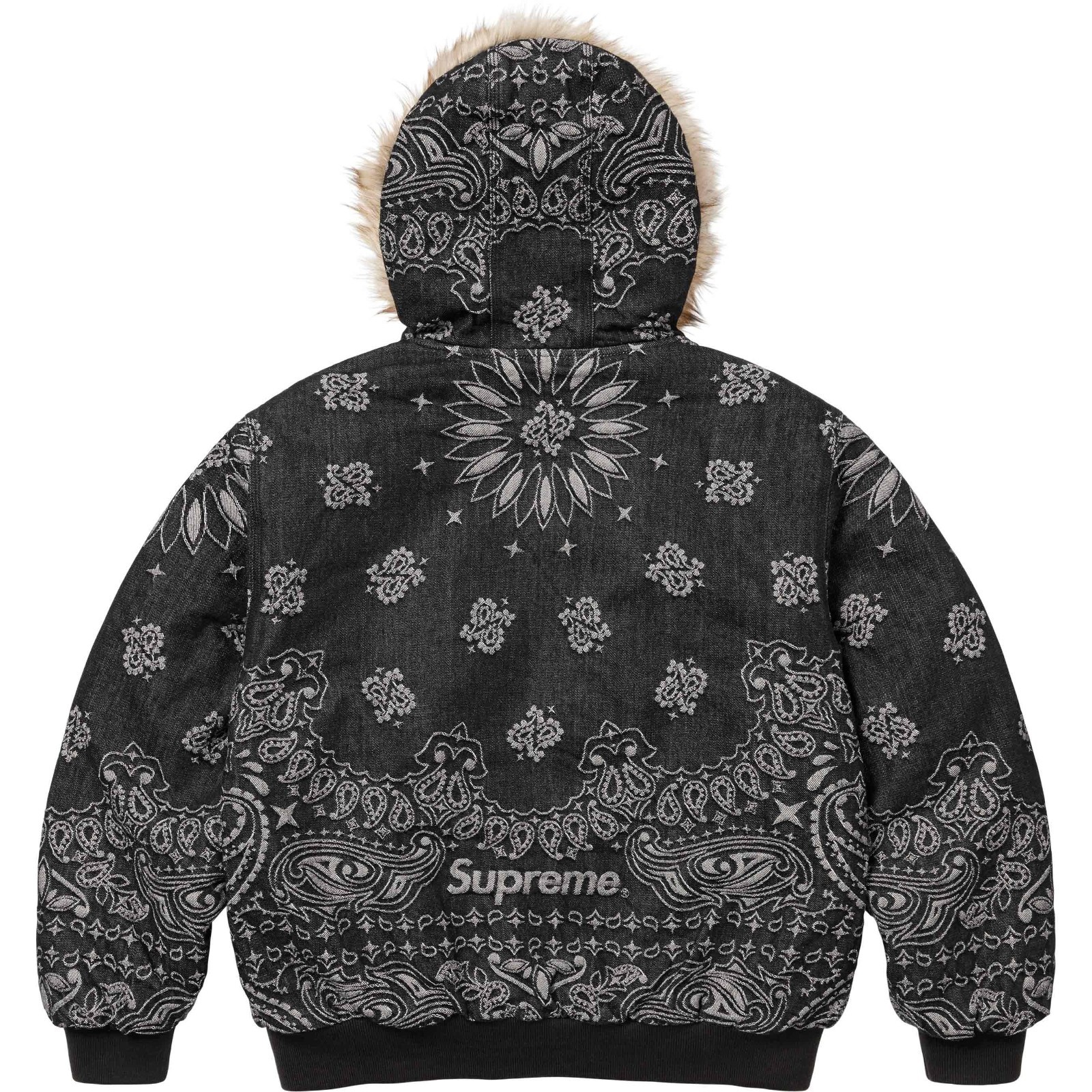 All cotton 13 oz. denim with jacquard woven pattern, 3M® Thinsulate™ insulation and quilted taffeta lining. Full zip closure with pouch pocket at lower front and interior chest pocket. Fixed hood with faux fur trim. Knit rib cuffs and hem.