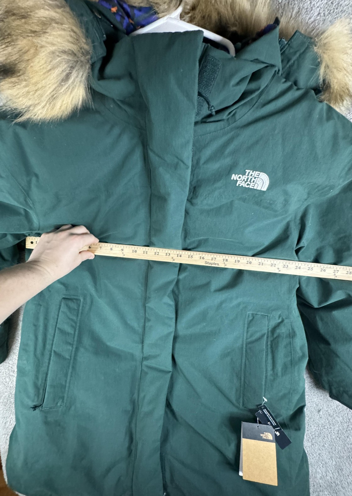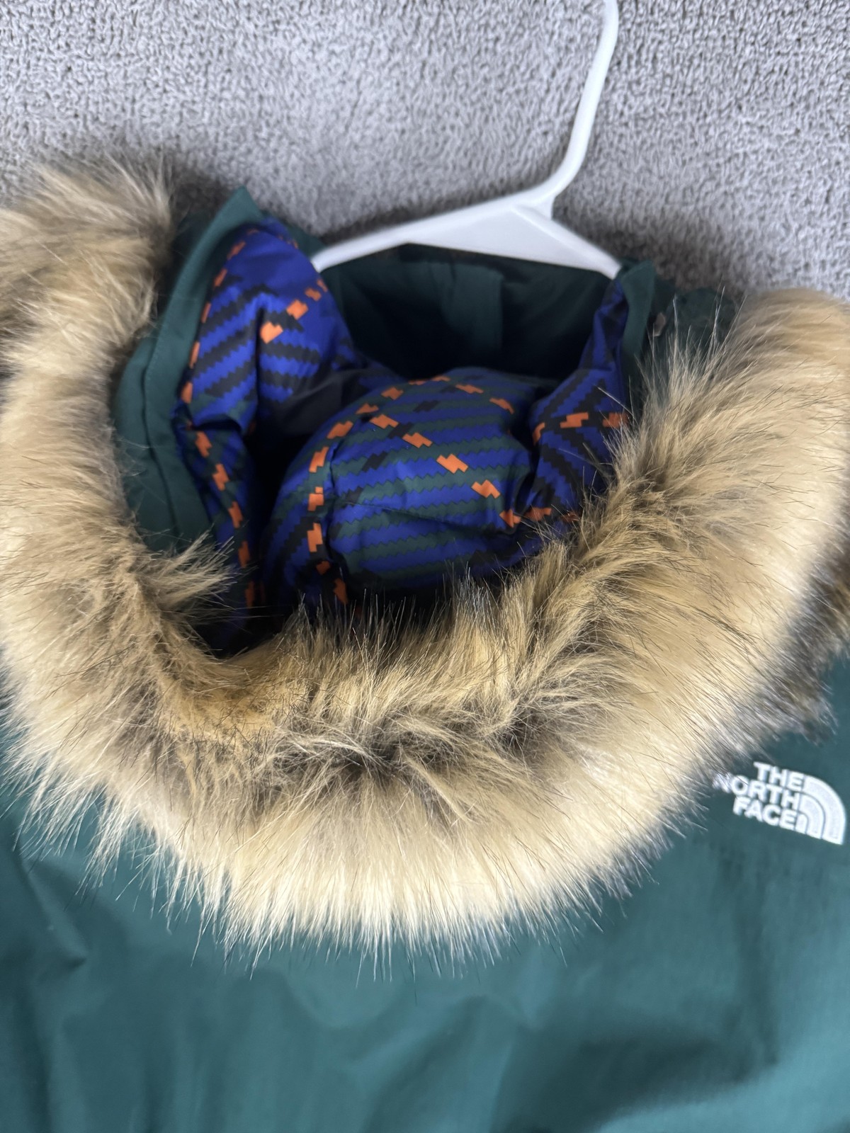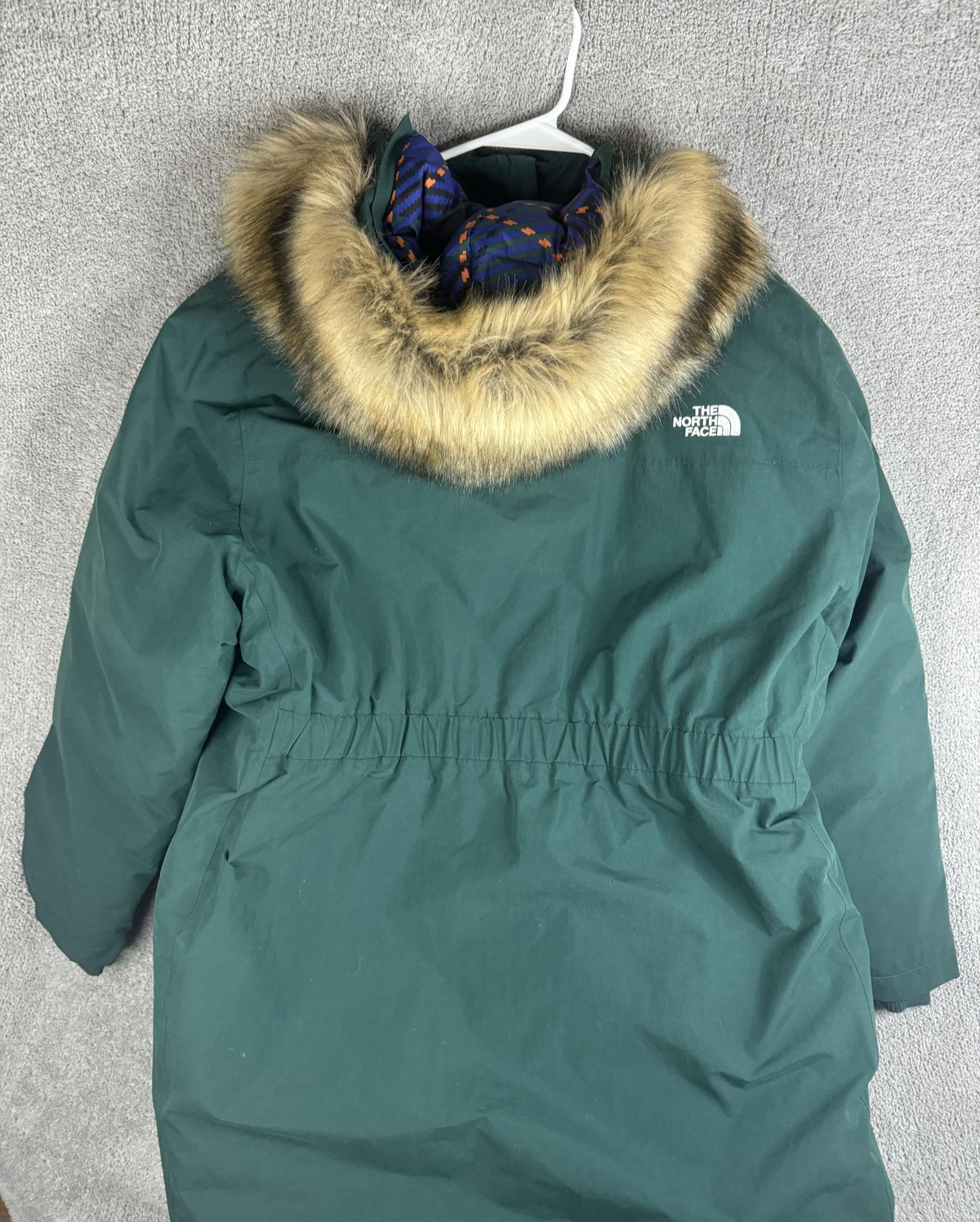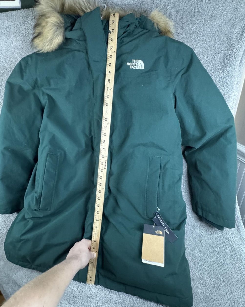 Details: Full-length front zipper with storm flap, attached hood with faux-fur trim, two front hand pockets, inner elasticized waist at back, long parka length for added coverage, The North Face logo at chest and back, recycled down hangtag.