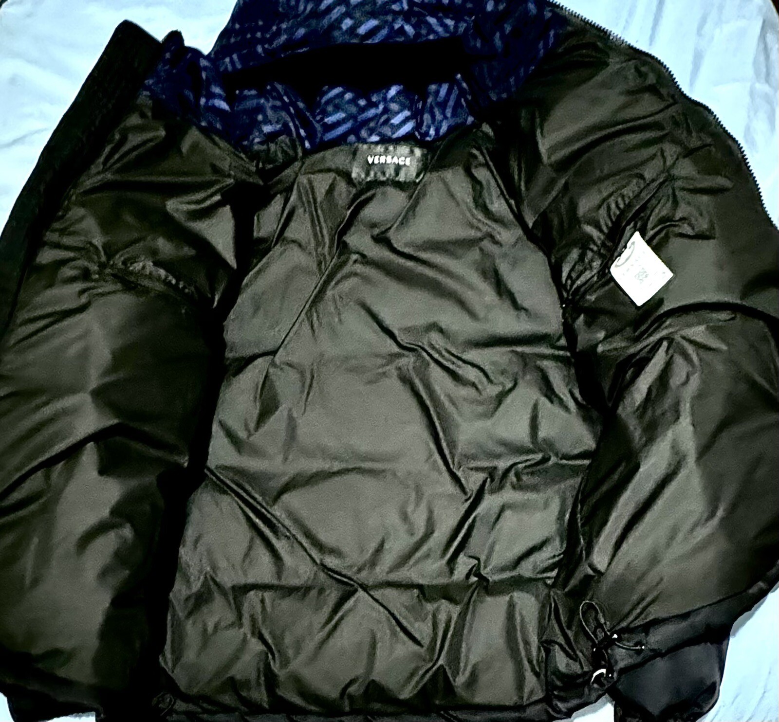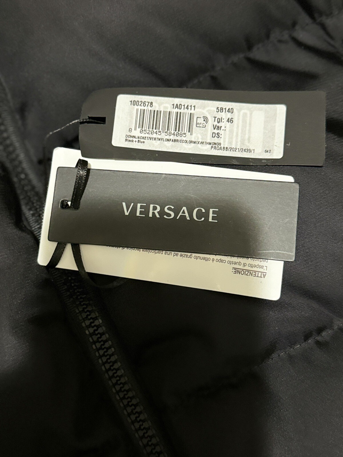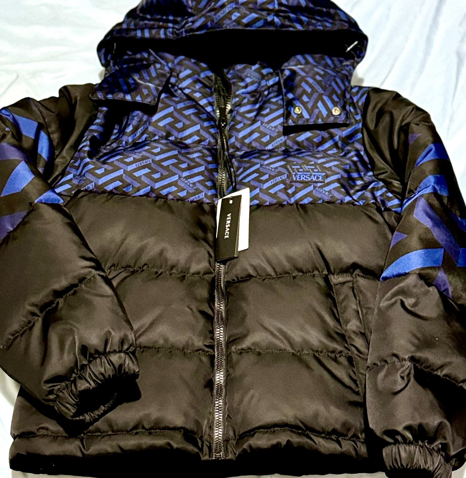 Elevate your winter wardrobe with this stylish black and blue down jacket from Versace. Made in Italy, this mid-length coat features a full zip closure with accents of the brand's iconic logo. Designed to be wind and water-resistant, it is perfect for any outdoor activity and it’s very warm.