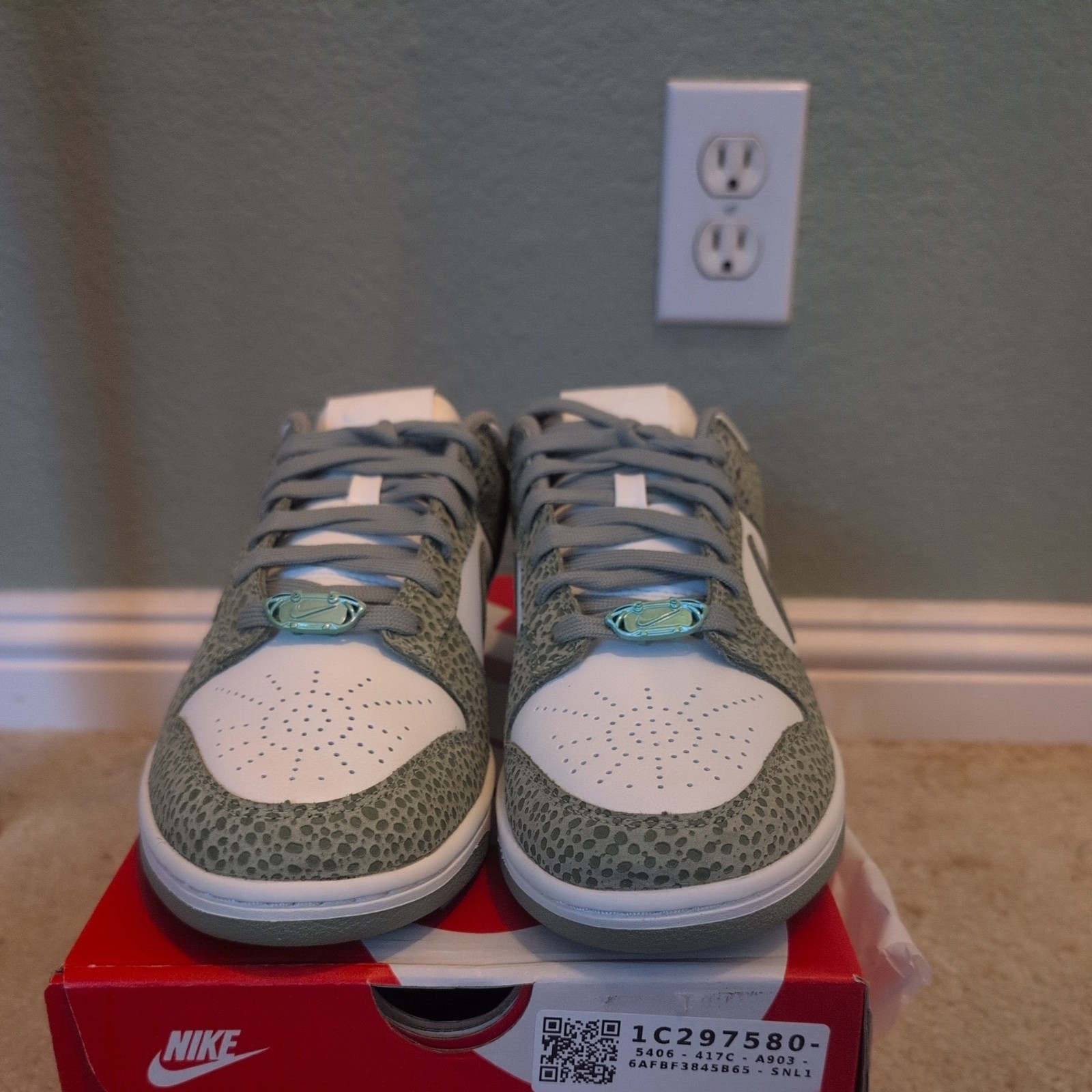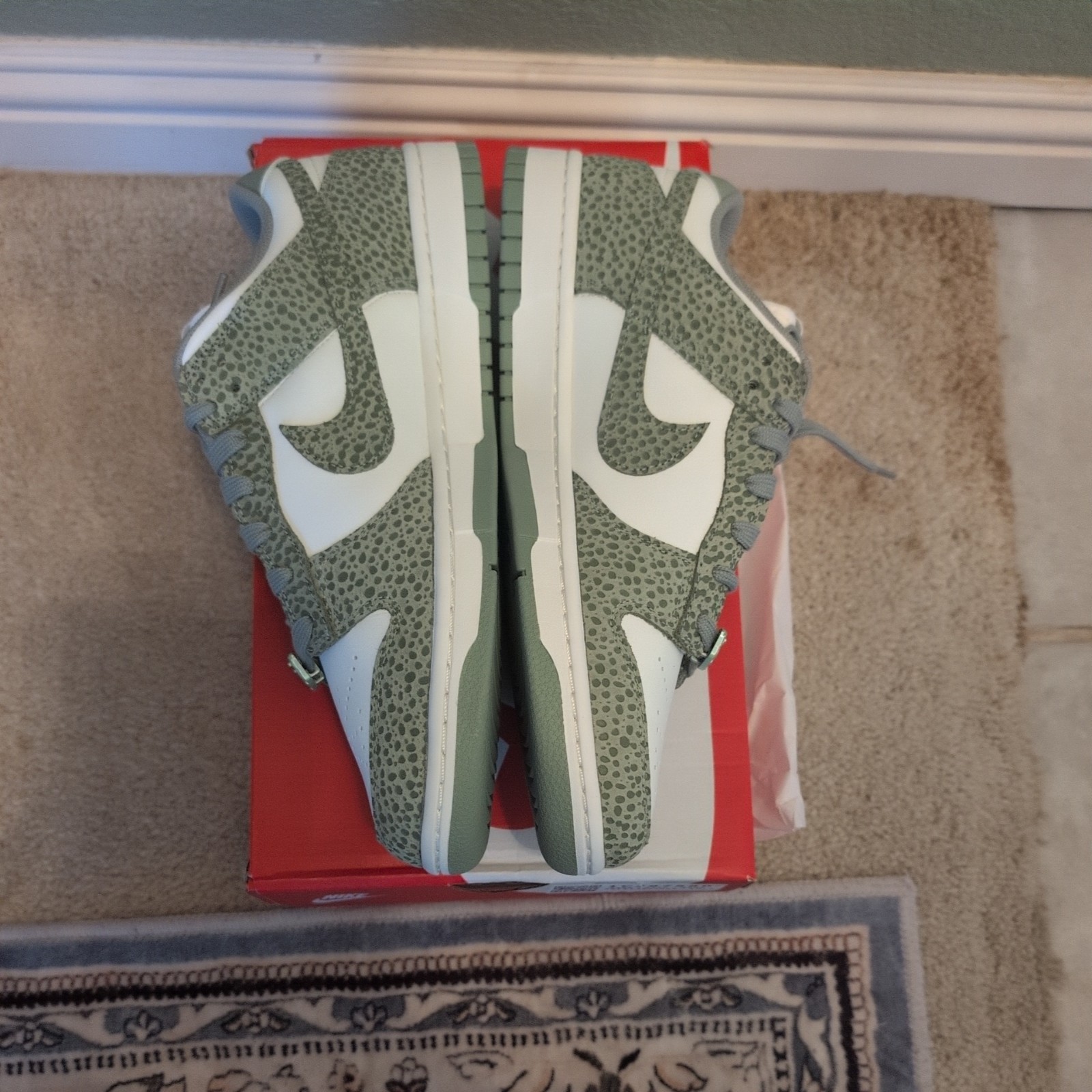 The W Nike Dunk Low Prm Safari Oil Green is a stylish and vibrant sneaker designed for women in size 12 or men in size 10.5. Featuring a low top shaft style, leather upper material, and a unique Safari Print Pack design in Honeydew colorway, this Nike Dunk model combines fashion and functionality. With its eye-catching green color and classic sneaker style, this athletic shoe is a must-have for those who appreciate both comfort and style in their footwear.