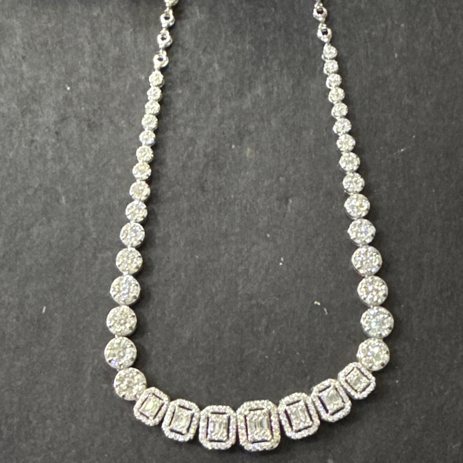 This 14K White Gold Natural VS & SI Diamond Necklace Earrings Ring Jewelry set features a stunning combination of baguette and round cut natural white/colorless diamonds, with a total carat weight of 4.36. The set includes earrings, necklace, and ring, all crafted with very good cut grade and clarity of VS-SI. The jewelry set is made in the United States with high-quality materials, making it a luxurious and elegant addition to any fine jewelry collection.