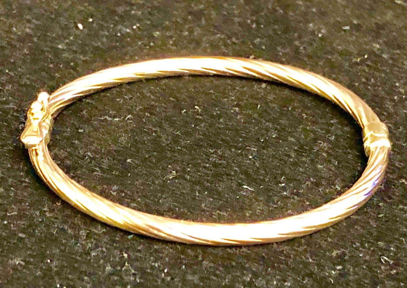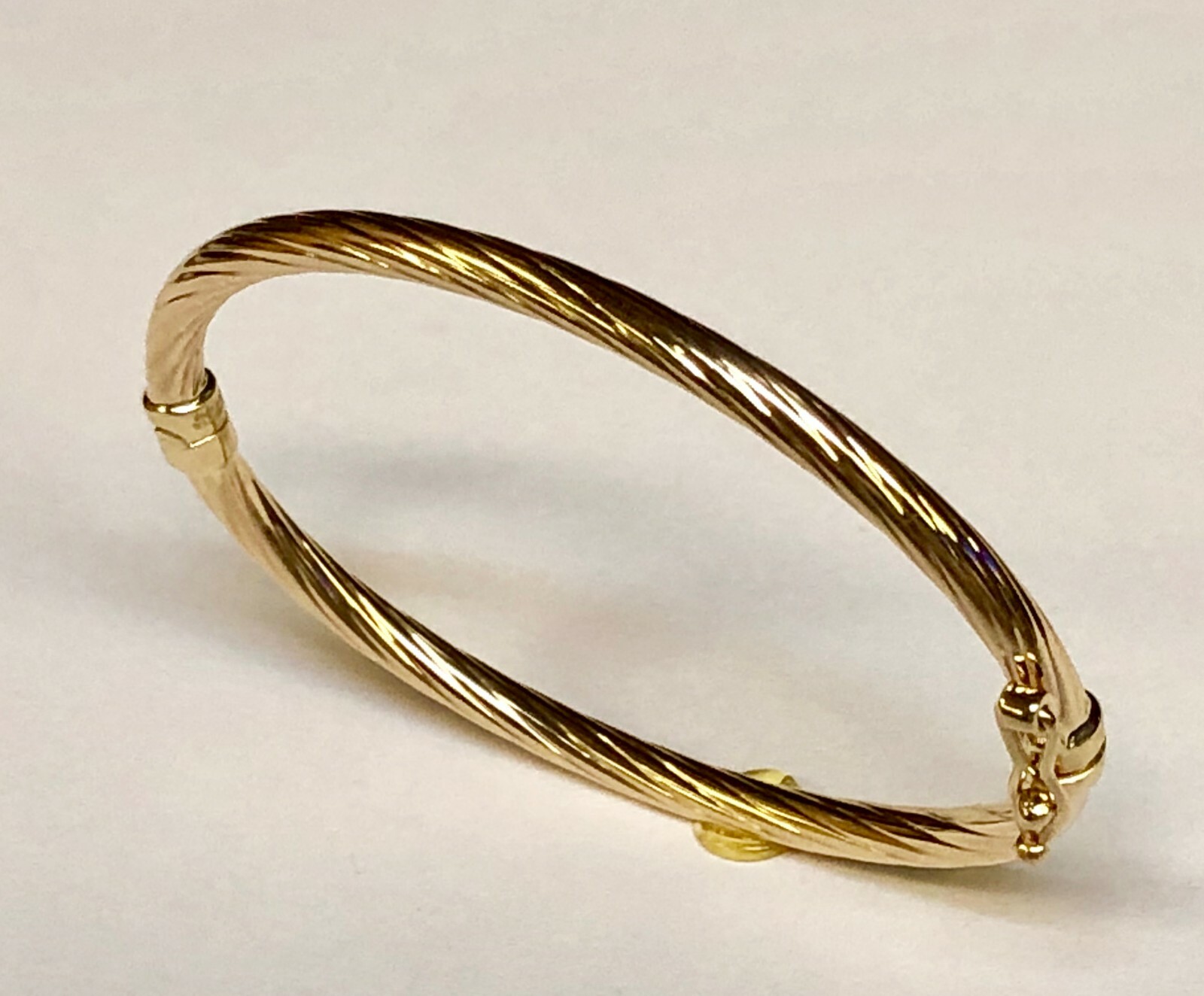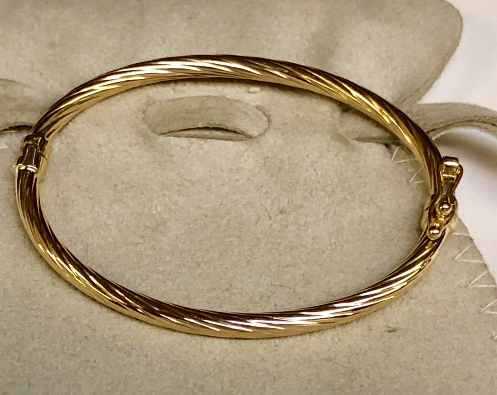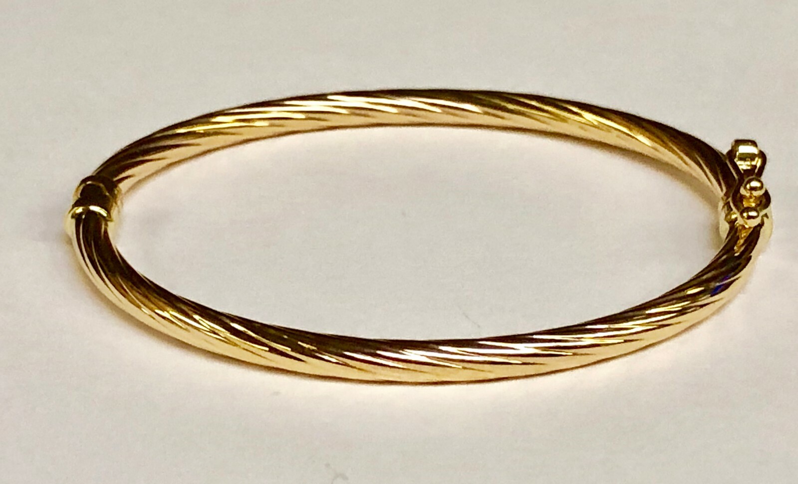 this 14 kt yellow gold, 3 mm wide, 5.5" high-polish shiny twisted fluted hinged baby bangle bracelet weighing approx 3 grams