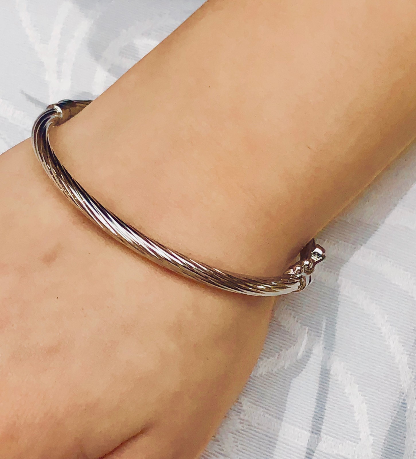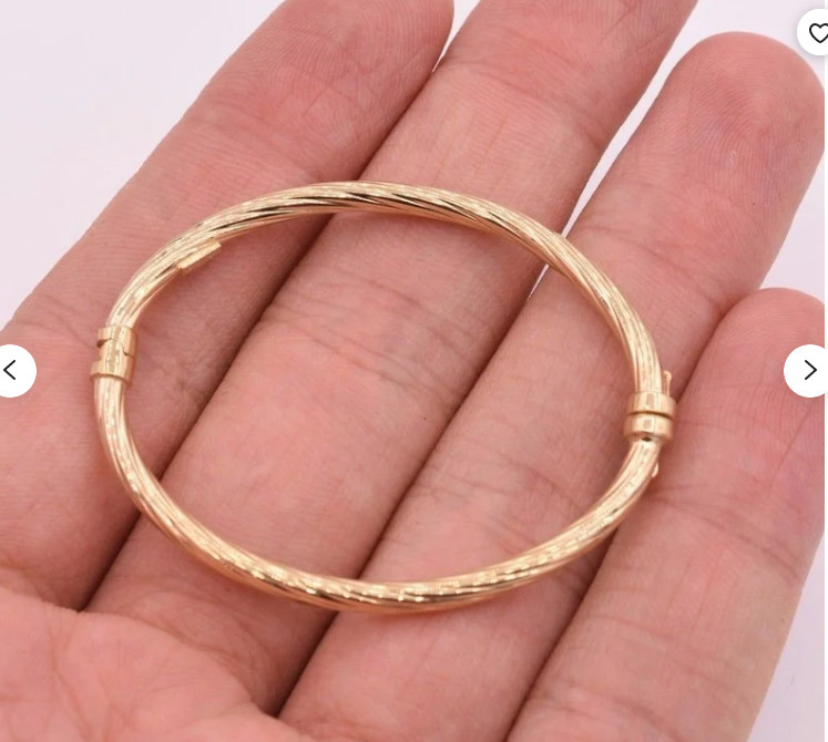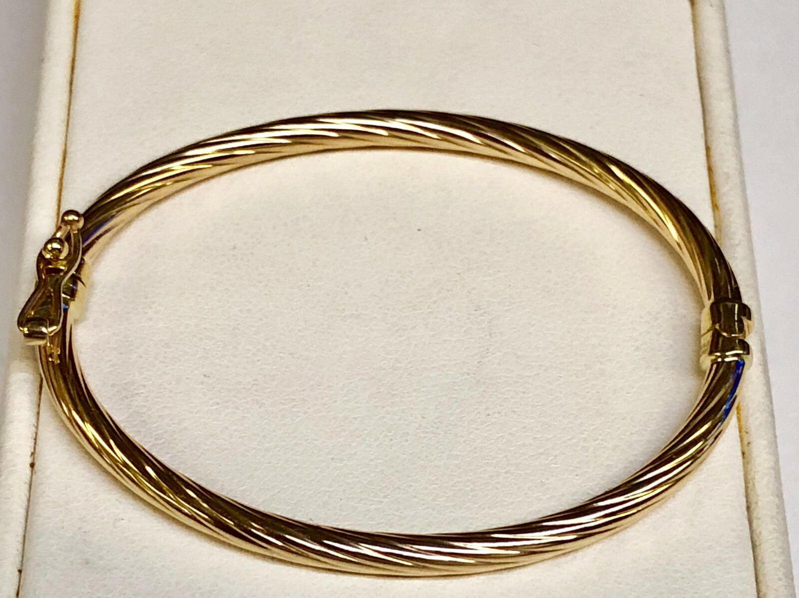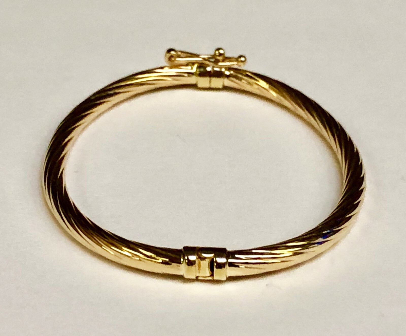 this 14 kt yellow gold, 3 mm wide, 5.5" high-polish shiny twisted fluted hinged baby bangle bracelet weighing approx 3 grams