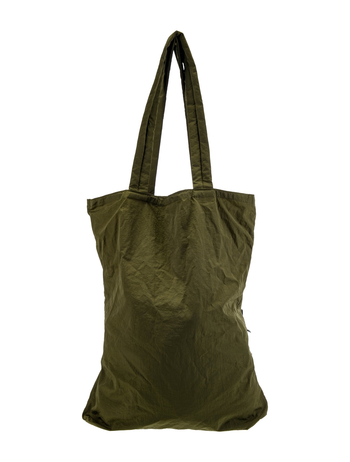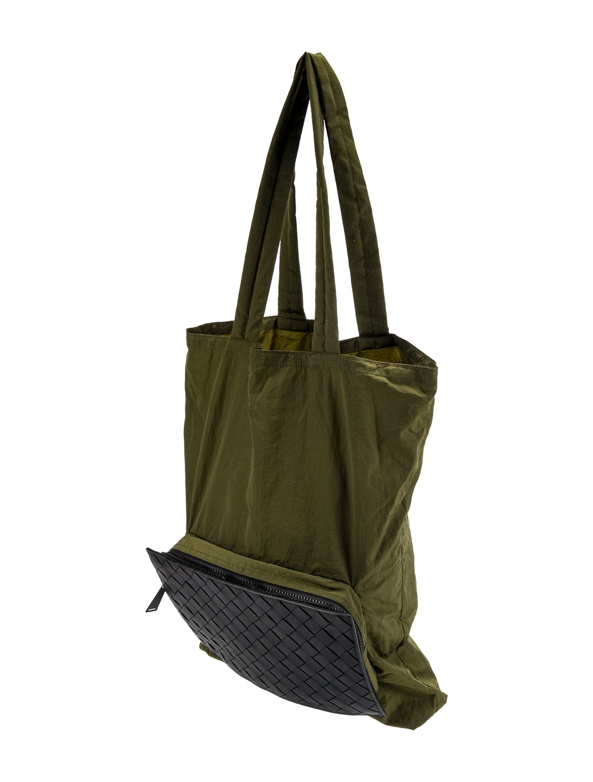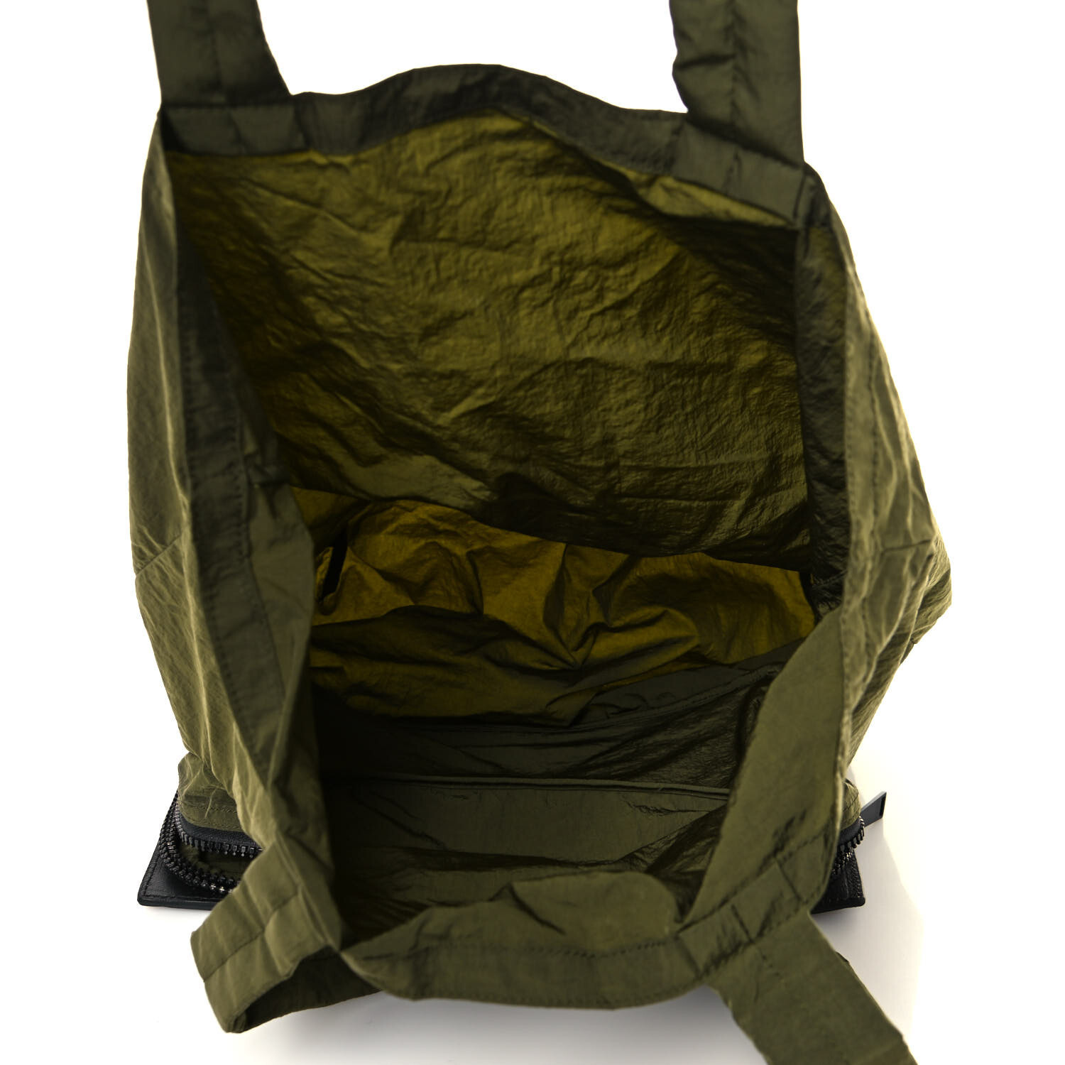 100% authentic Bottega Veneta NWT unisex nylon and leather folding tote bag purse which I purchased at a Bottega Veneta boutique and never used (dust bag included). This useful tote bag is perfect on it's own or great for travel since it folds up into itself. It features a rich khaki nylon with a signature Intrecciato Black woven leather pocket which it can fold into. Measurements are approx. 14" wide; 16." high; 3" deep; strap drop 10". A super unisex accessory, and would also make a great gift if you could bear to give it up!