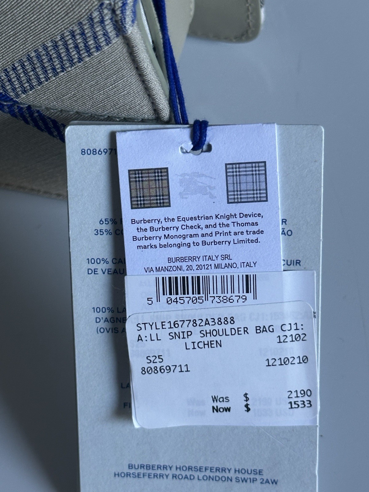 Burberry Snip Shoulder Bag Lichen Italy 80869711 Italy NWT $2190