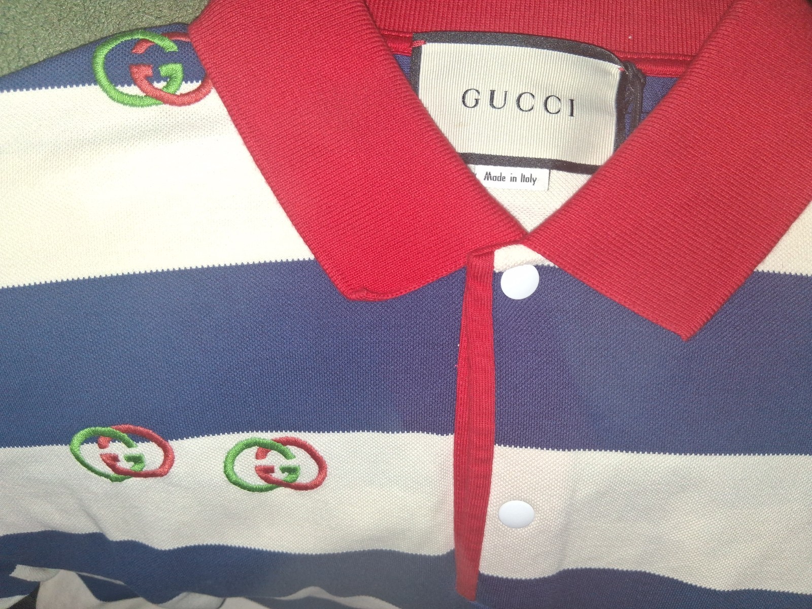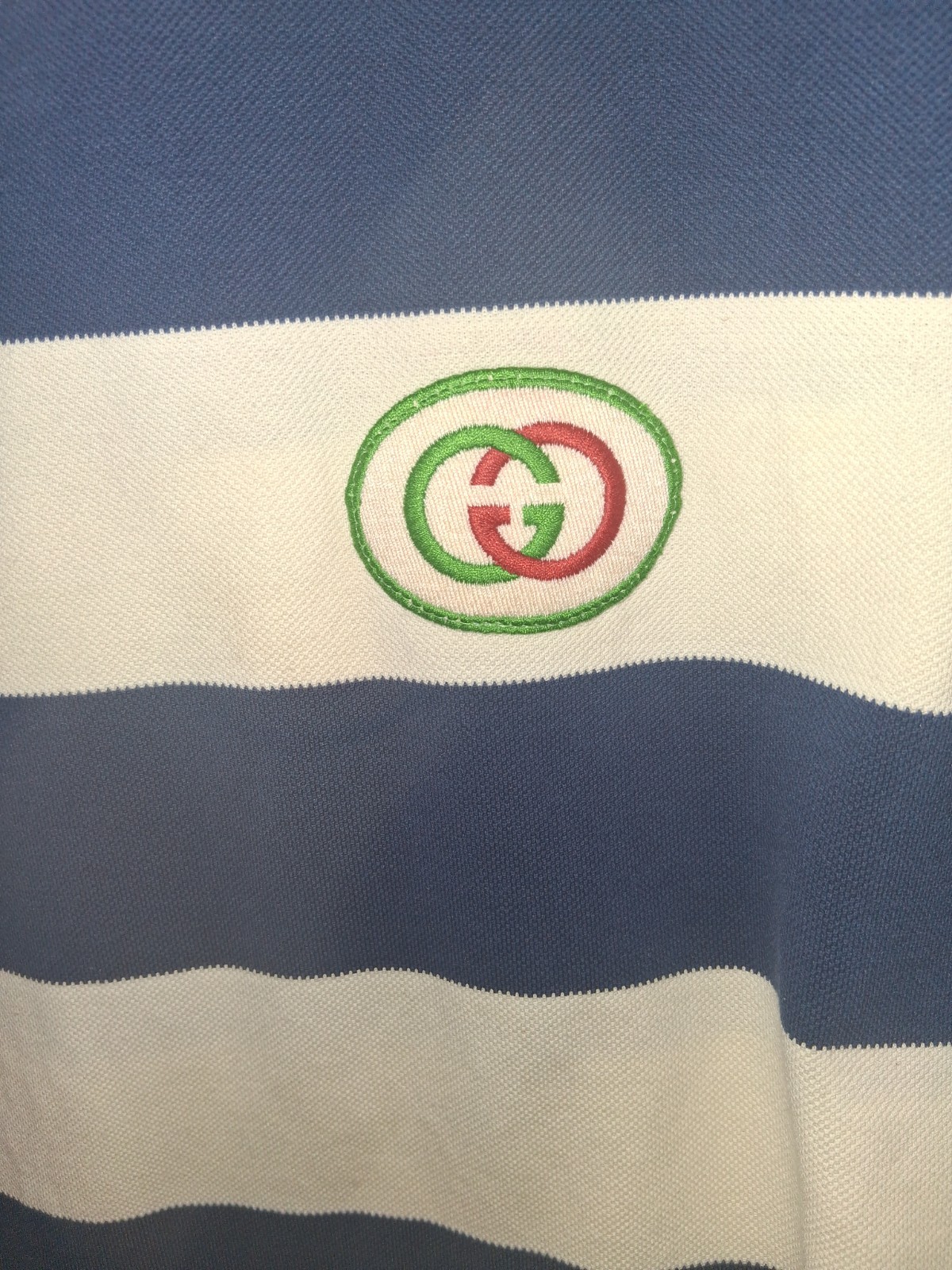 The Gucci Blue and Ivory Striped Polo Shirt with Green Red Interlocking GG Embroidery is a stylish and luxurious addition to any man's wardrobe. This polo shirt features a classic striped pattern in blue and ivory, with intricate embroidery details of the iconic Gucci interlocking GG logo in green and red. Made for a regular fit and size XL, this shirt is perfect for casual wear during the summer, fall, and spring seasons. With its quality craftsmanship and high-end brand, this polo offers both comfort and sophistication for any occasion.