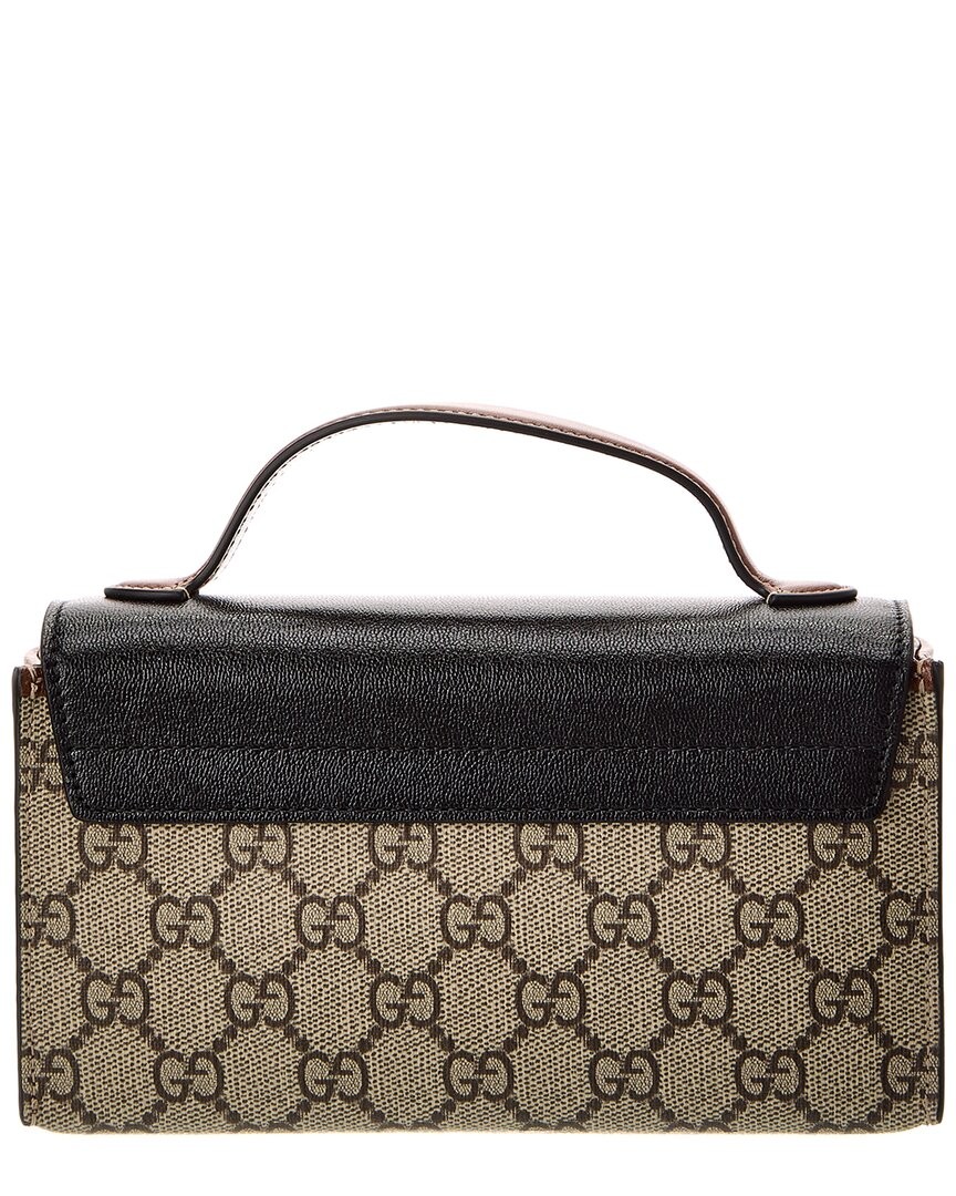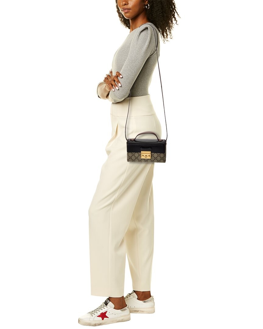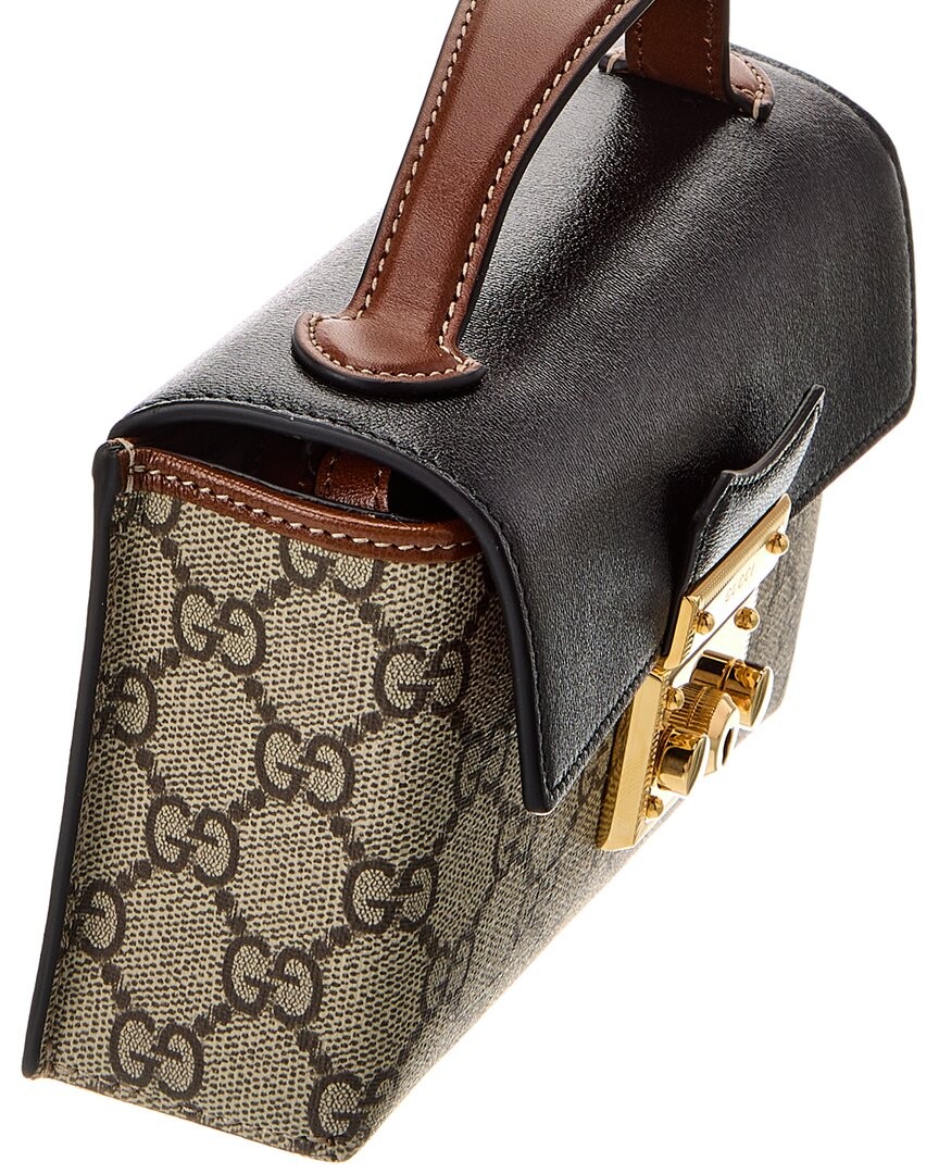 About the brand: Eclectic and coveted. Italian luxury redefined.. Made in Italy. Mini Padlock GG Supreme Canvas & Leather Shoulder Bag in GG supreme canvas and black and brown leather and light fine gold hardware. Interior design details: microfiber lining, leather card slots. Measures 7.5in wide x 4.5in high x 2in deep. Top handle drops 2in. Adjustable and removable shoulder strap drops 24in. Fold-over flap with pushlock closure. Please note: All measurements were taken by hand and are approximate; slight variations may occur.. Our products are 100% genuine. In some cases we purchase merchandise from trusted independent suppliers and not directly from the brand owner. In all cases we stand by the authenticity of every product sold on our site.