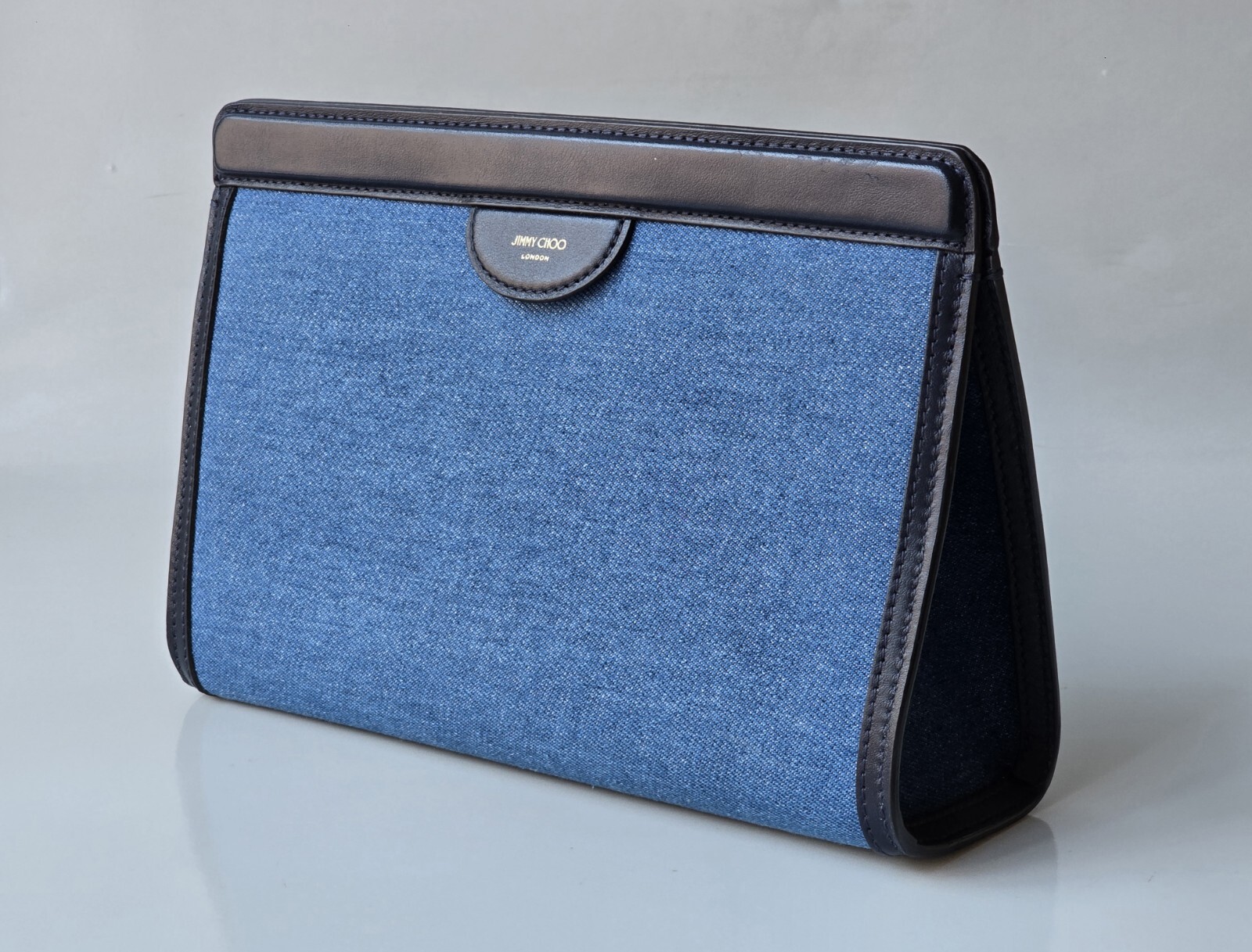 Gorgeous Jimmy Choo Medium Clutch Bag done in blue denim and navy leather with an embossed Choo logo.