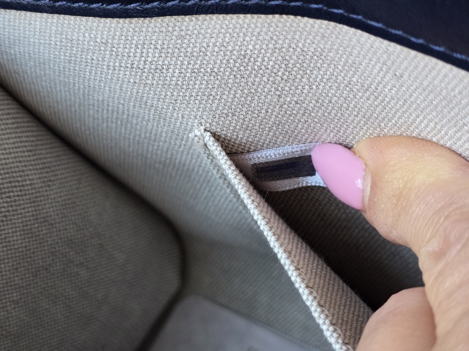 This bag features a magnetic closure, pull tabs on both sides, beige fabric lining, and interior pocket.