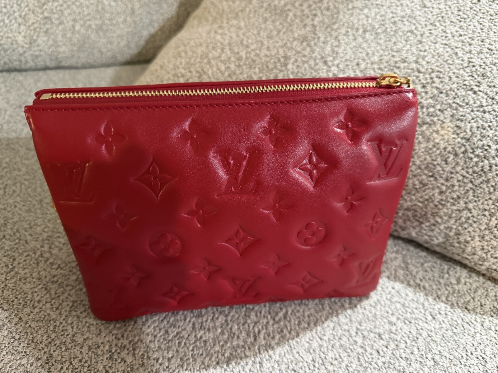The Louis Vuitton Coussin BB Pearl Rouge M21191 is a stylish shoulder bag made of red leather with a monogram pattern. This medium-sized bag features a rectangular shape and a zip closure, with gold-plated hardware and a metal handle/strap. It is a part of the Louis Vuitton Coussin product line and is a brand new item in its original box and accessories. Ideal for women who appreciate luxury fashion, this bag combines elegance and functionality with its classic design and high-quality materials.