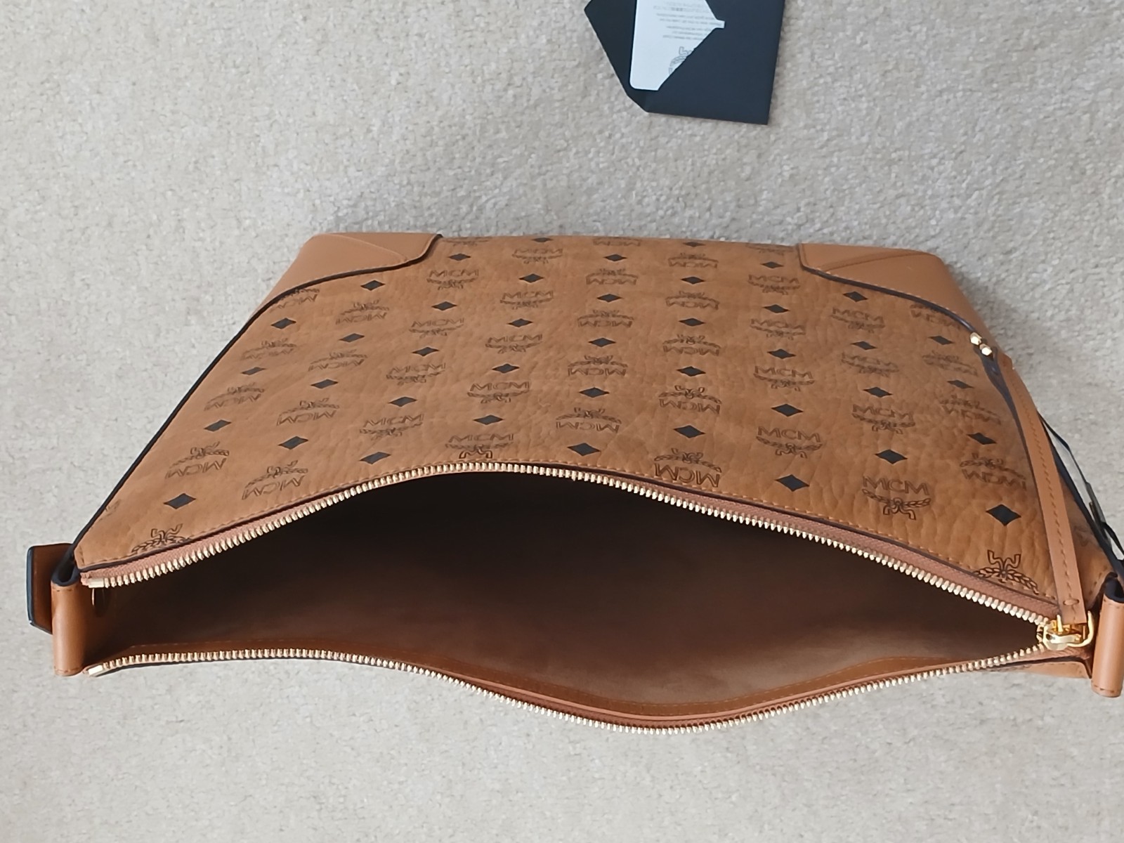 MCM Klara Visetos Large Hobo Bag, new with tag, never used. Gorgeous Nappa leather with embossed MCM monogram, adjustable strap, zip enclosure with leather pull and metal key ring. Beautiful camel colored suede lining. Gold finished metalware. Original MSRP $880 (see tag). Includes dust bag.