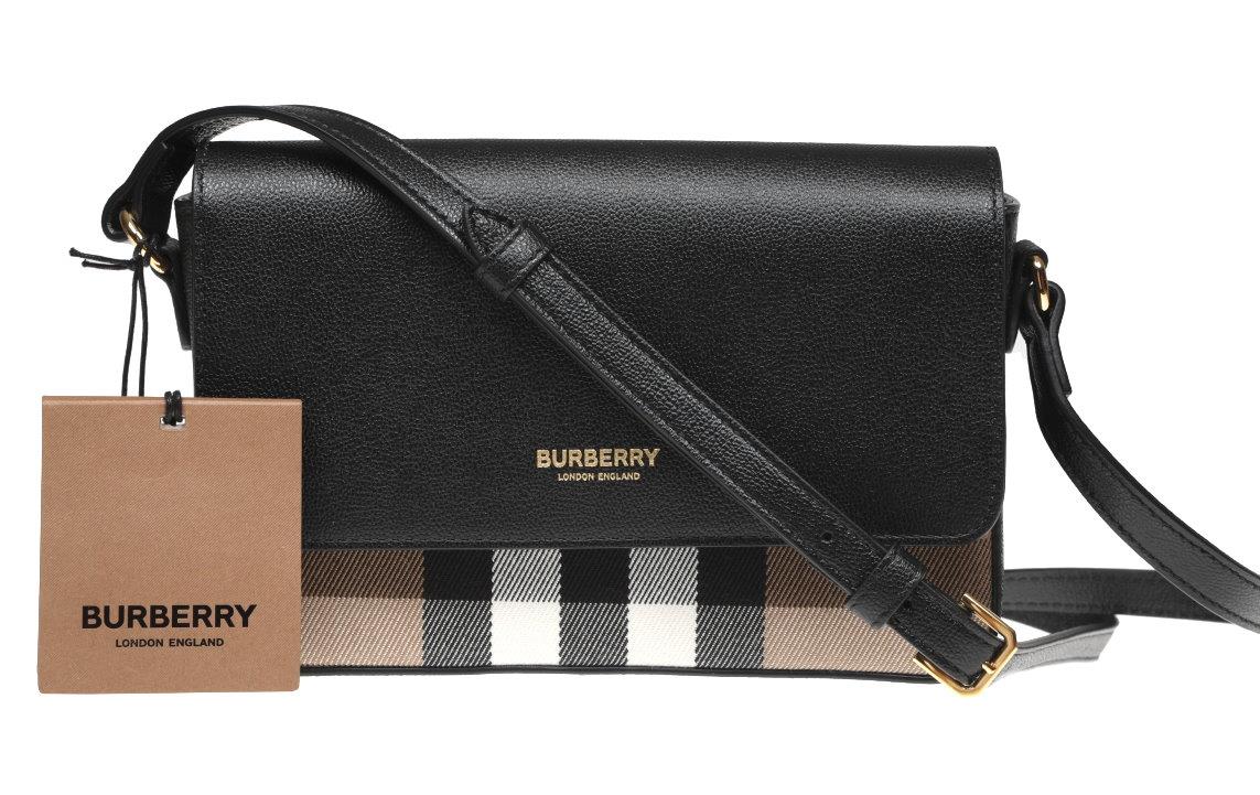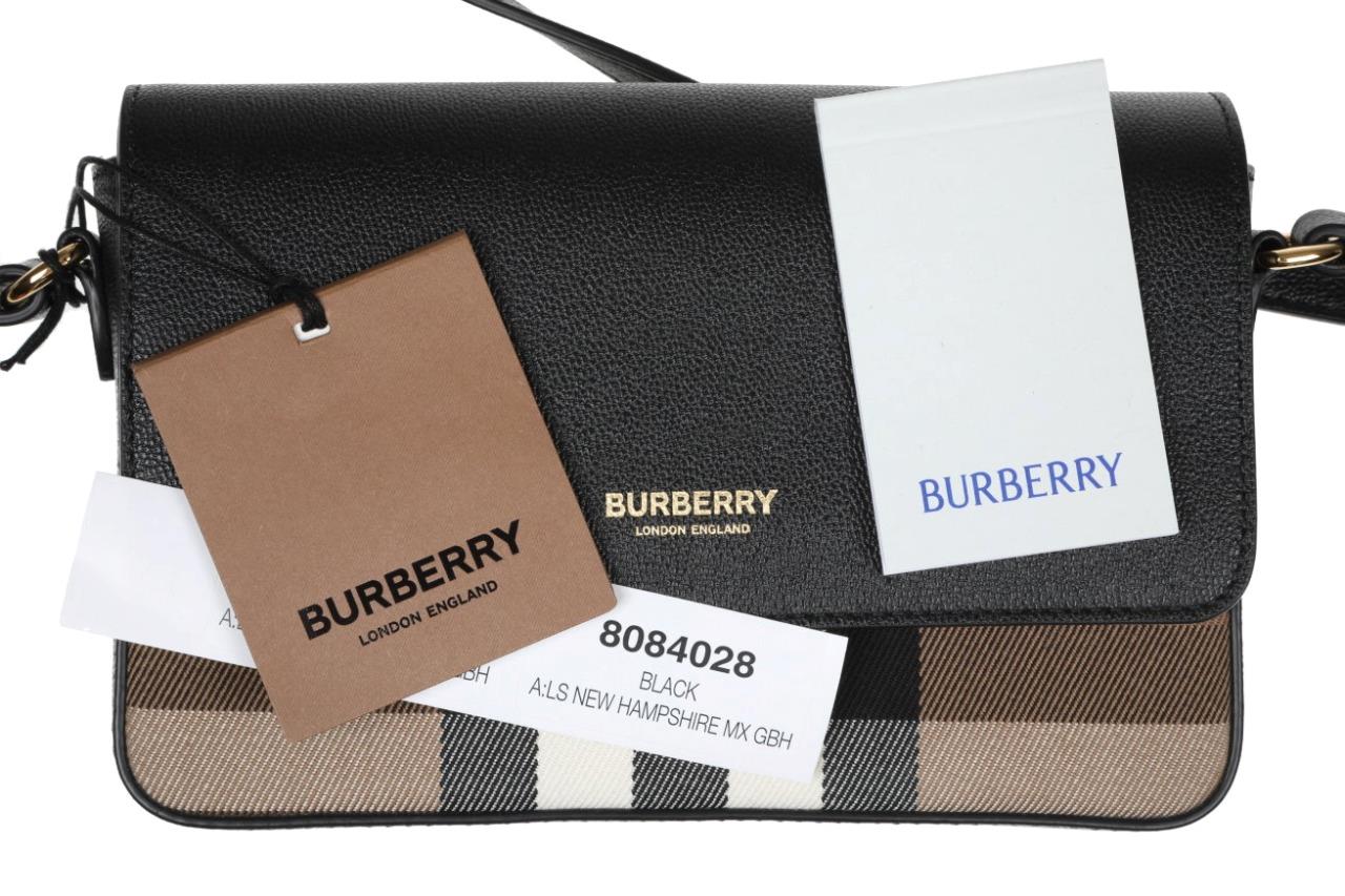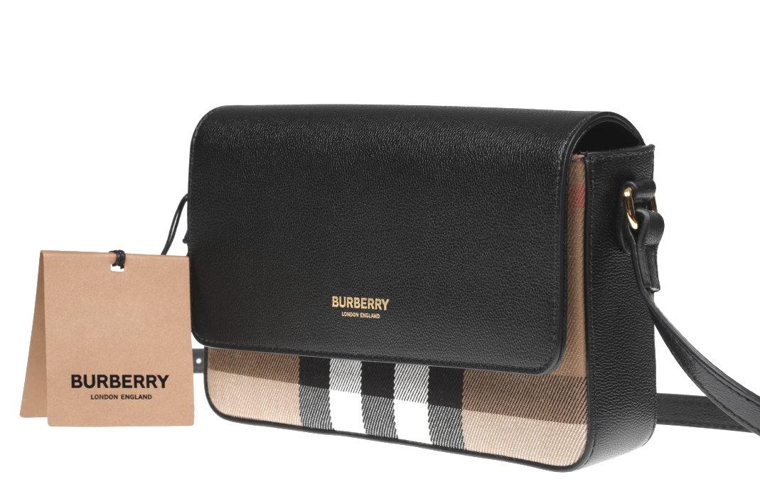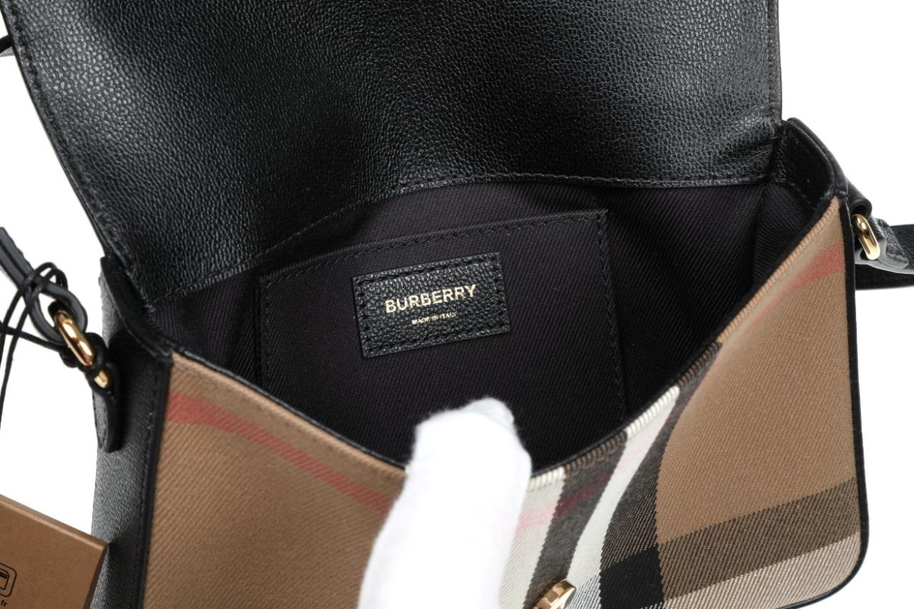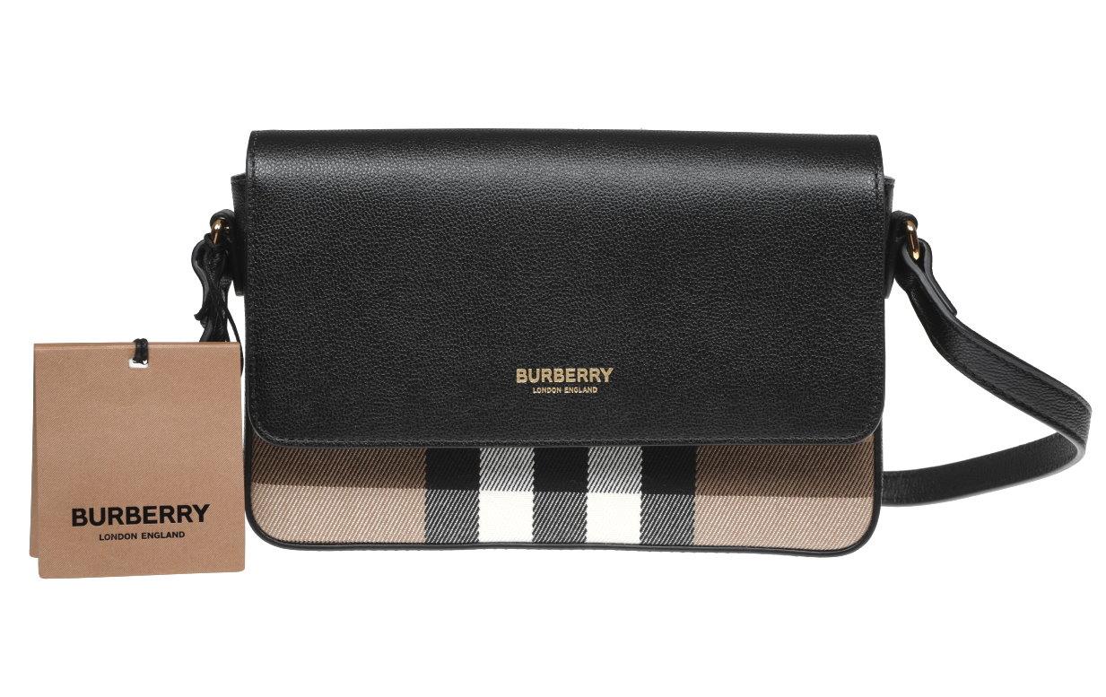 NEW WITH TAGS AND DUST BAG BURBERRY LADIES CROSS BODY SHOULDER BAG. MADE IN ITALY. 100% AUTHENTICITY GUARANTEED. LUXURY QUALITY BLACK LEATHER, SIGNATURE CHECK CANVASDETAILS. SNAP CLOSURE. ADJUSTABLE SHOULDER STRAP, INSIDE SMALL POCKET BURBERRY EMBOSSED. SIZE 8"X 5.5"X 1.75"