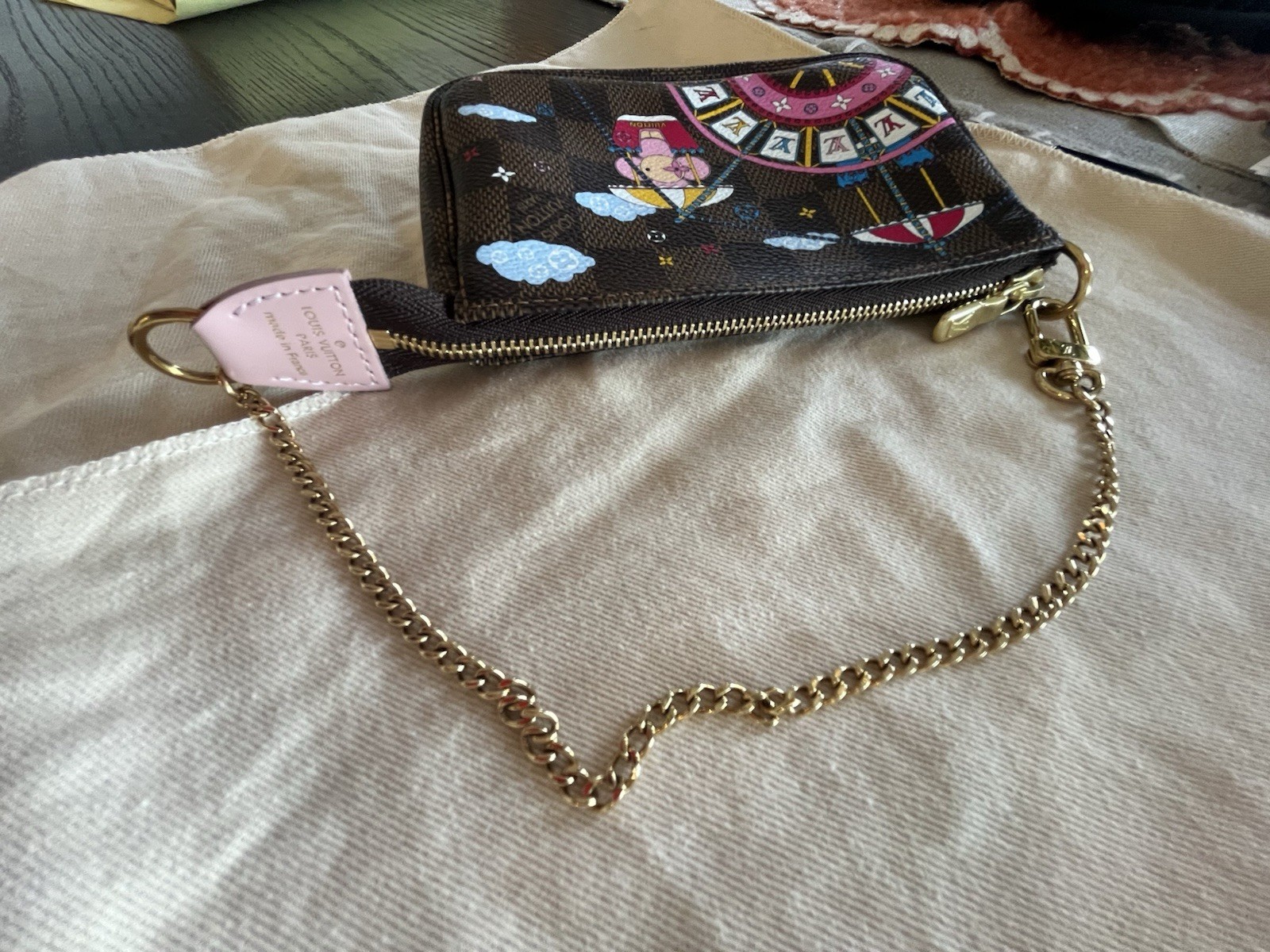 The Vivienne Mini Pochette Bag is perfect for carrying your everyday essentials and is ideal for any occasion. Its small size makes it easy to carry in your purse or bag, while the coated canvas material ensures durability and longevity. This is a rare and limited edition item from Louis Vuitton, making it a true collector's item. This adorable mini pochette has a canvas exterior with the Damier Ebene Illustre print. The interior is light pink fabric and the end tab is light pink. The chain wristlet strap is fixed. This mini pochette has been stored in my home since purchase. It remains in unused condition. It is clean and I am not noticing and flaws or hardware scuffing. However, it is not fresh out of the boutique.