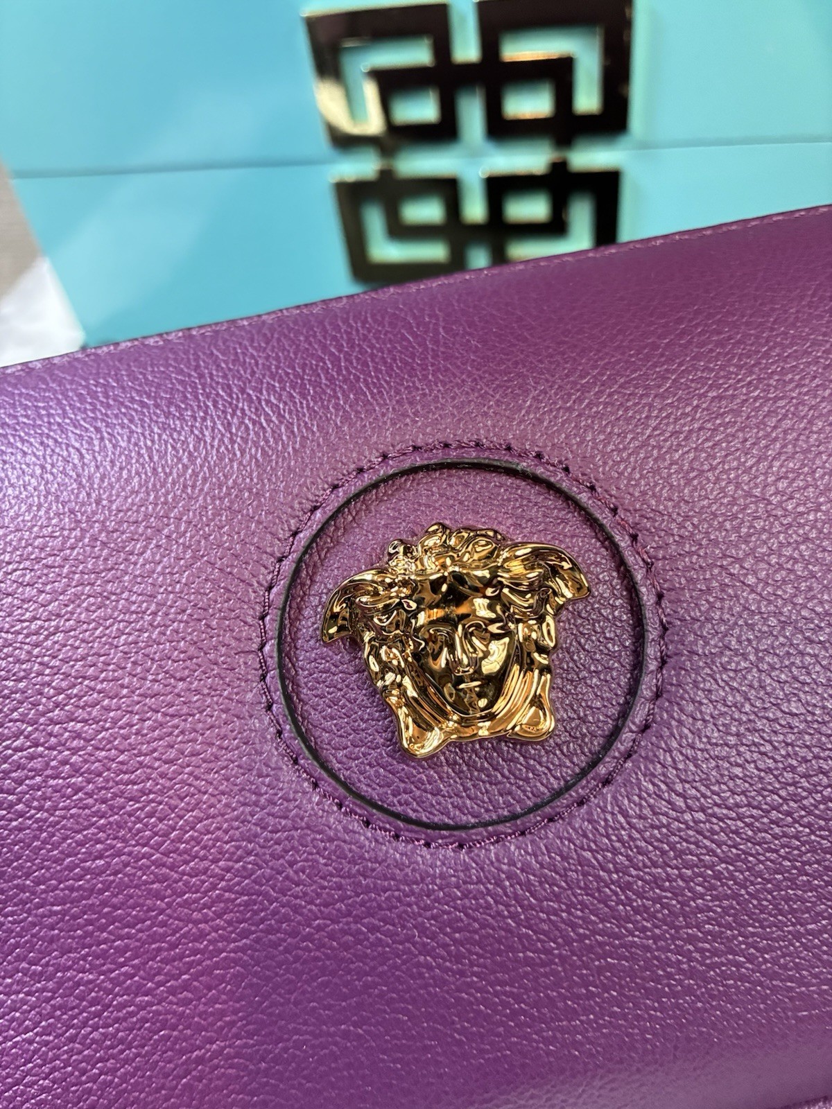 Beautiful, brand new with tags, soft leather shoulder bag. Gorgeous gold hardware including the Medusa head on the front. I see a lot of this style bag out there, but hardly ever in this amazing purple color. Black fabric interior with a large card pocket.