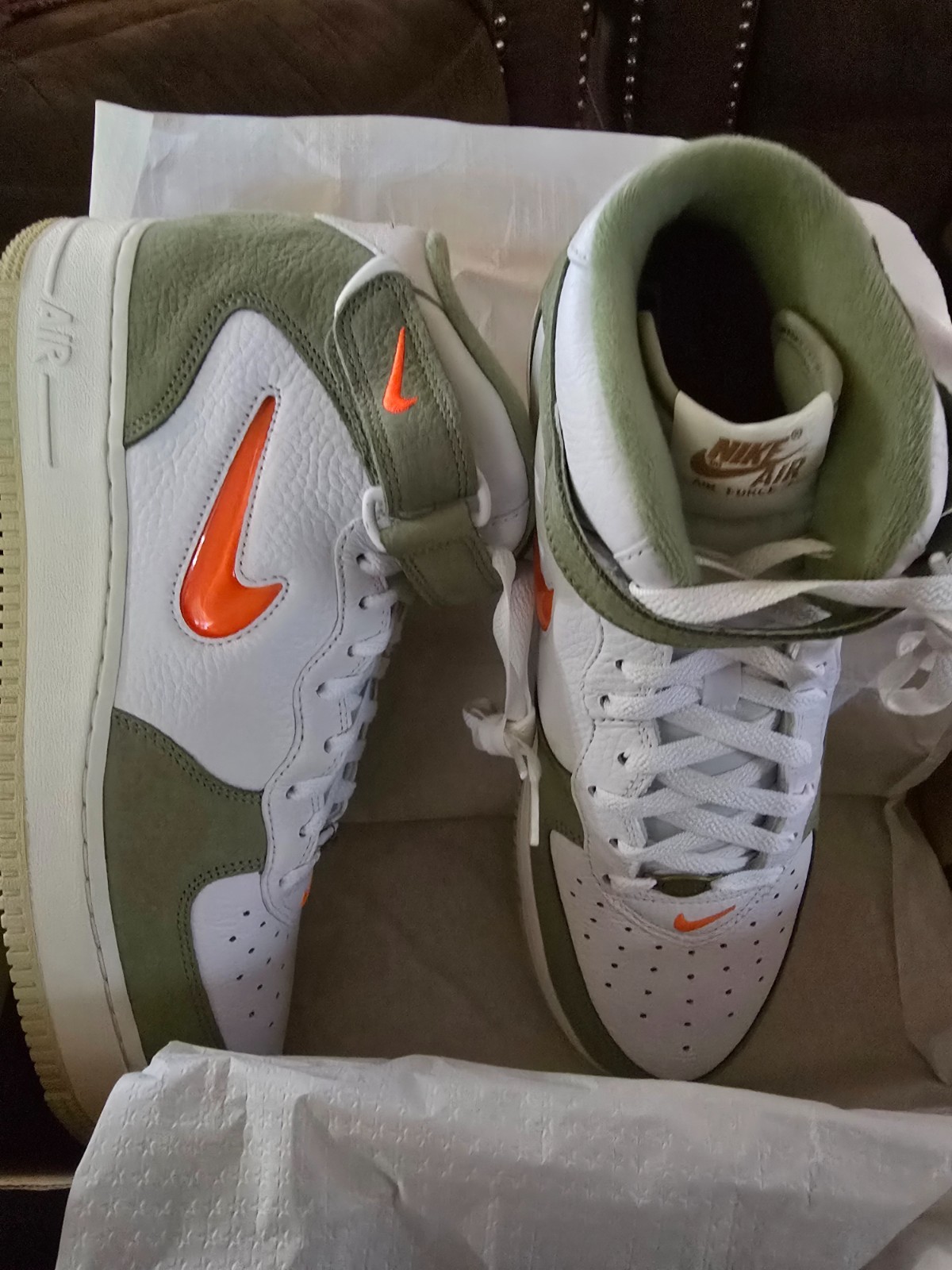 The product is a Nike Air Force 1 QS Mid sneaker in the color oil green with orange accents. This athletic shoe features a mid-top style with a leather upper and is part of the Nike Air Force product line. With a US shoe size of 12, this shoe is designed for men and was released in 2022. The style code for this specific model is DQ3505-100.