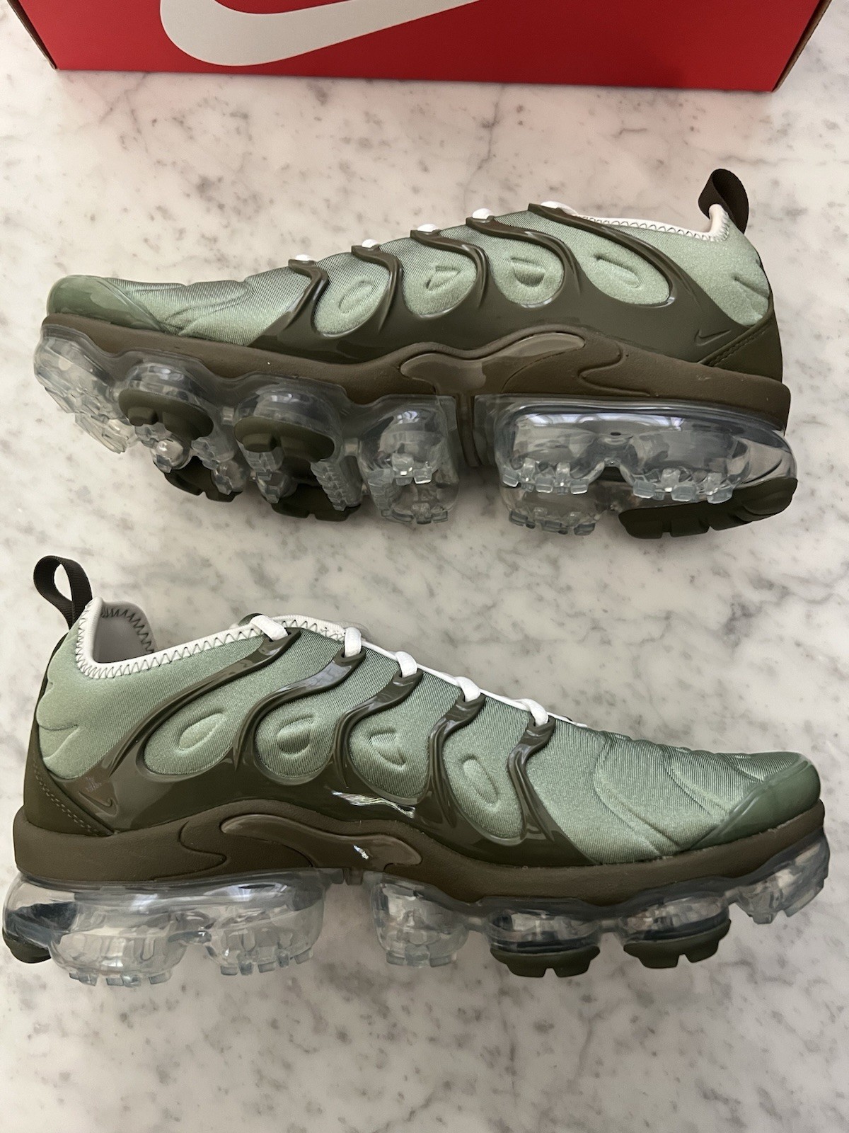 This is a brand new, unworn pair of Nike Air VaporMax Plus “Oil Green” sneakers in US Men’s Size 8.5