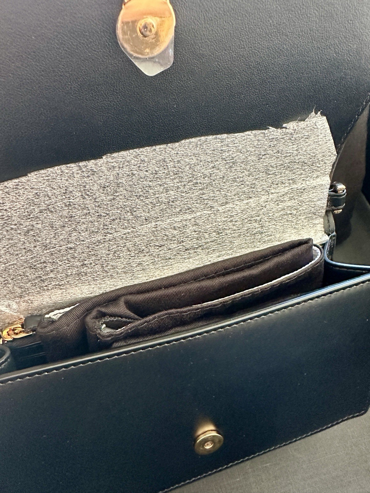 Black calf leather exterior, gold Greca Hardware/clasp, leather lined interior w/card slots + zip pockets