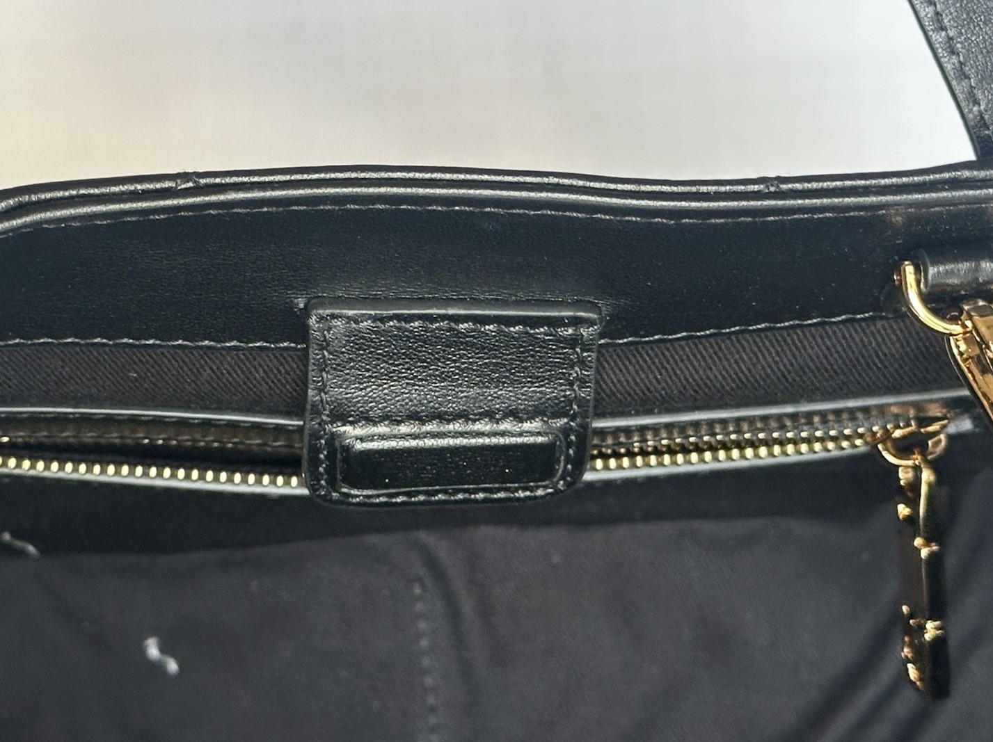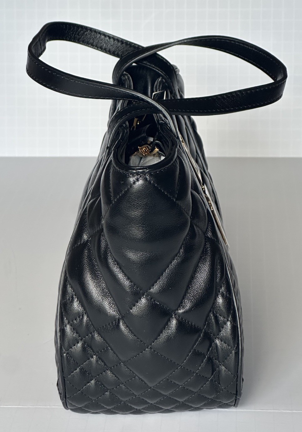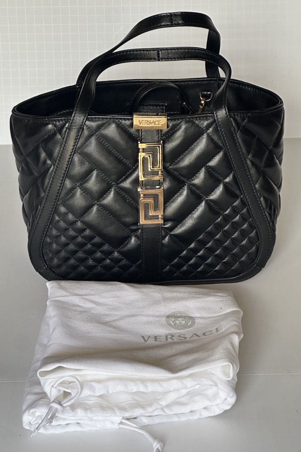 This Small tote bag is crafted from supple leather featuring a quilted pattern and top handles. The design is adorned by the signature Greca chain hardware and the interior has a zipped pocket and a protector strap. Greca hardware Top handle Magnetic button strap closure Internal zipped pocket