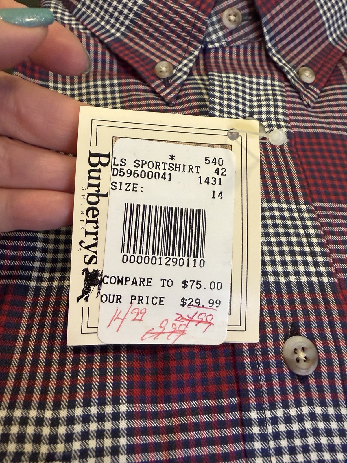 Bag with original tags. Size is large. I did not want to unfold it to measure it, but from the hang tags, I think the chest measurement should be 42”. Beautiful red and navy check pattern. The fabric is super soft, as you would expect from a fine quality shirt. Chat GPT dated the labels on the shirt to the late 1980s or early 1990s, which is consistent with the vintage clothes I purchased from this estate.