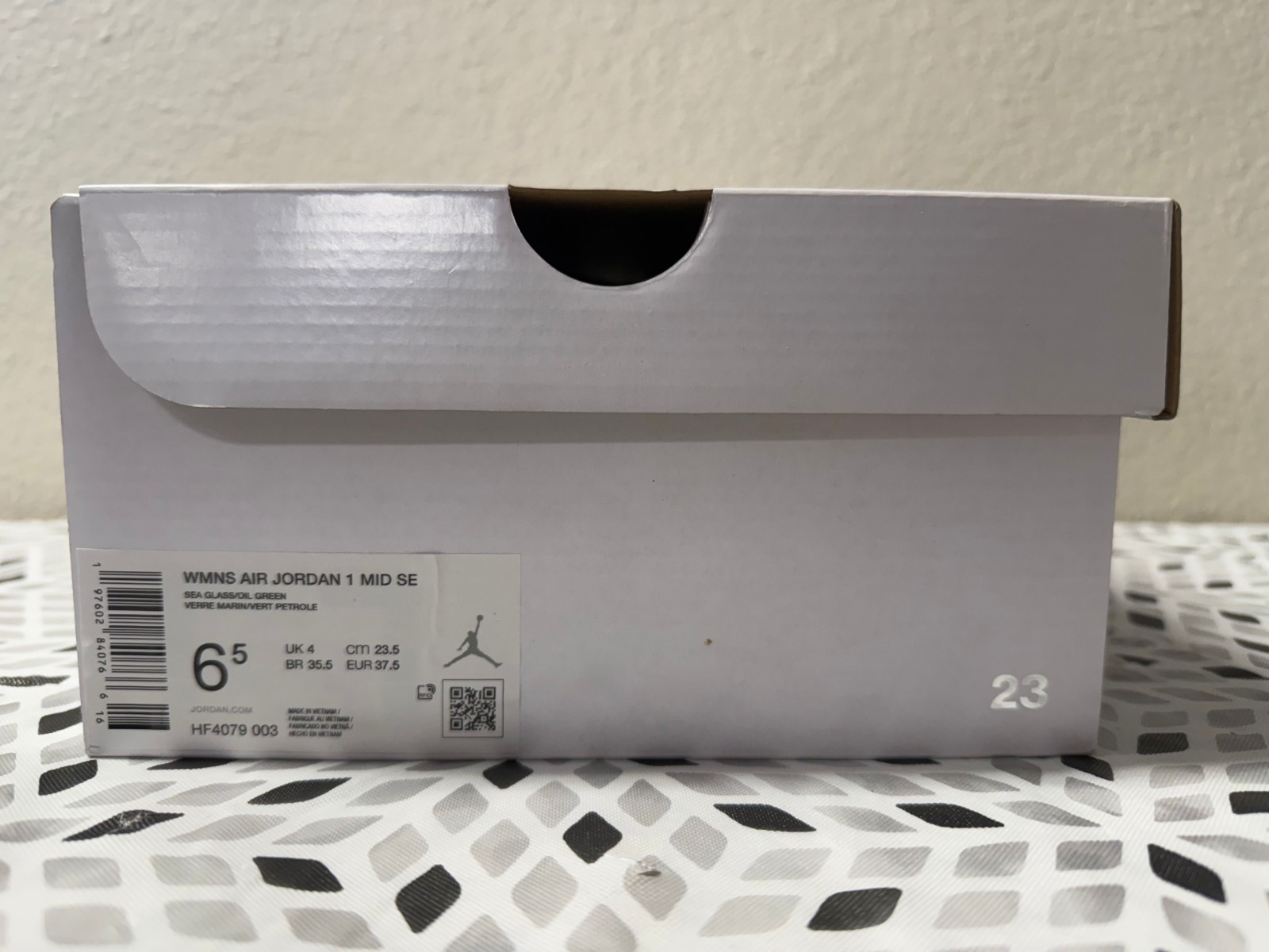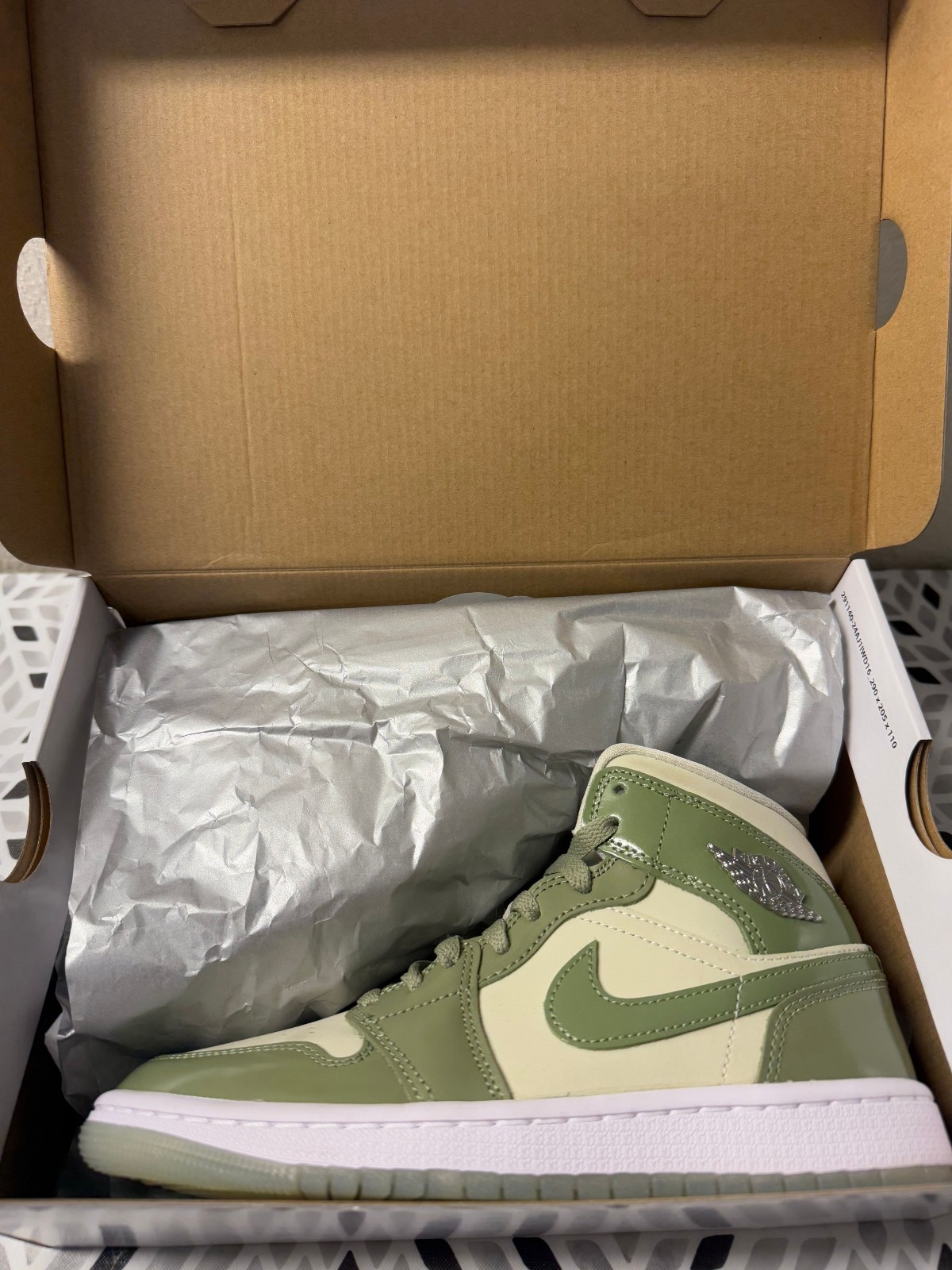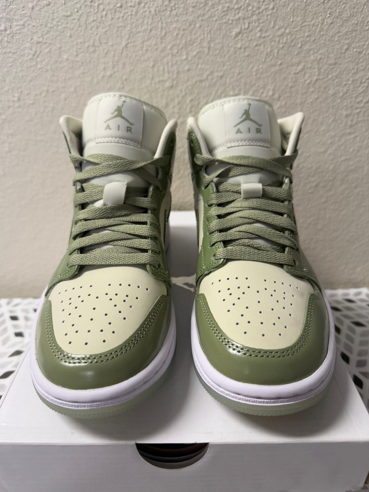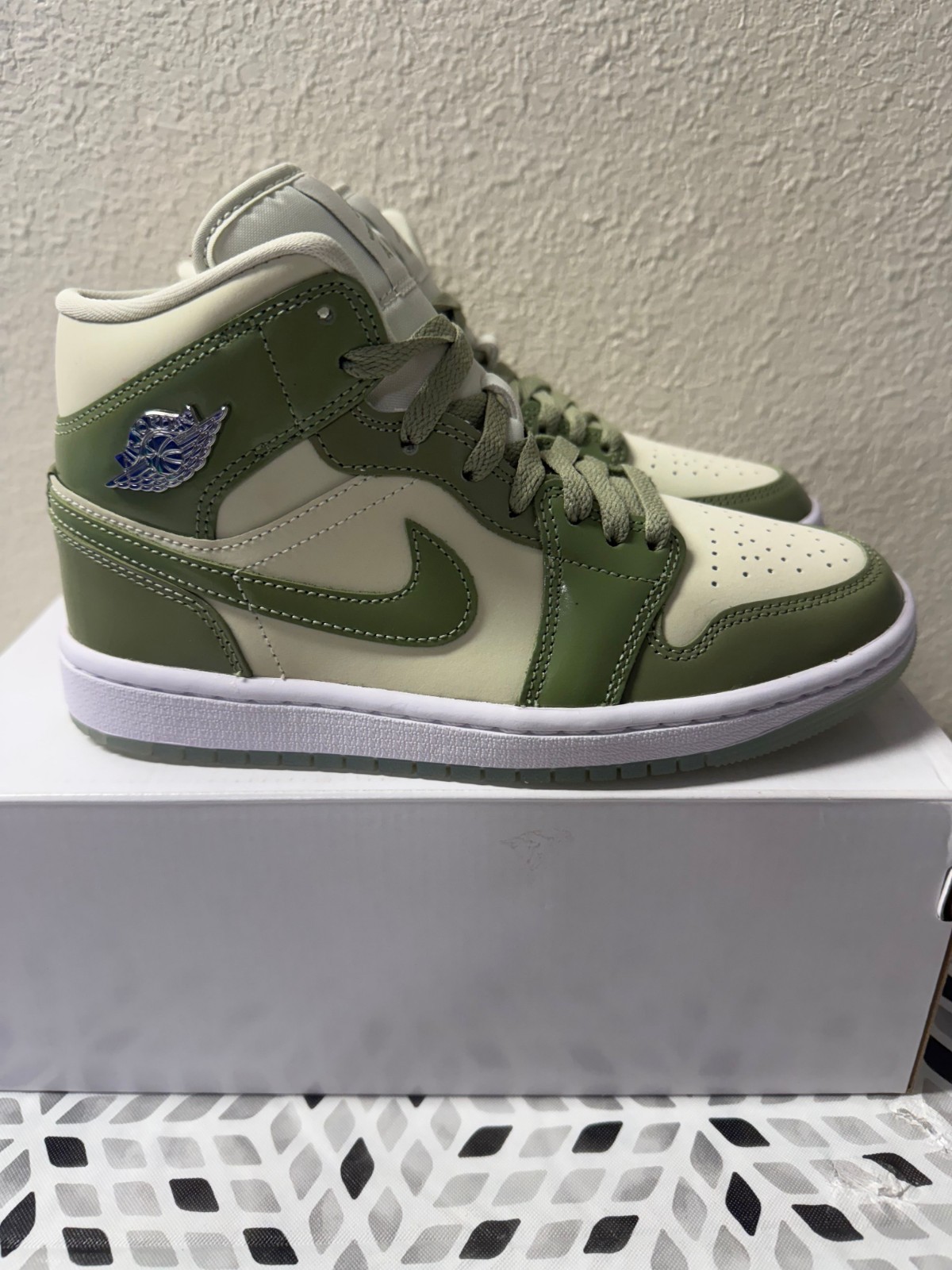 The Women's Nike Air Jordan 1 Mid Oil Green Sea Glass Olive Grey HF4079-003 in size 6.5 is a stylish Mid Top sneaker perfect for casual occasions. Featuring a lace-up closure, rubber outsole, and comfortable foam insole, these shoes offer both style and comfort. With a beautiful green color and logo accents, these shoes are a fashionable choice for any season. Made with leather and fabric lining, these Jordan 1 Mid sneakers are a must-have for any athletic or fashion-forward woman's wardrobe.